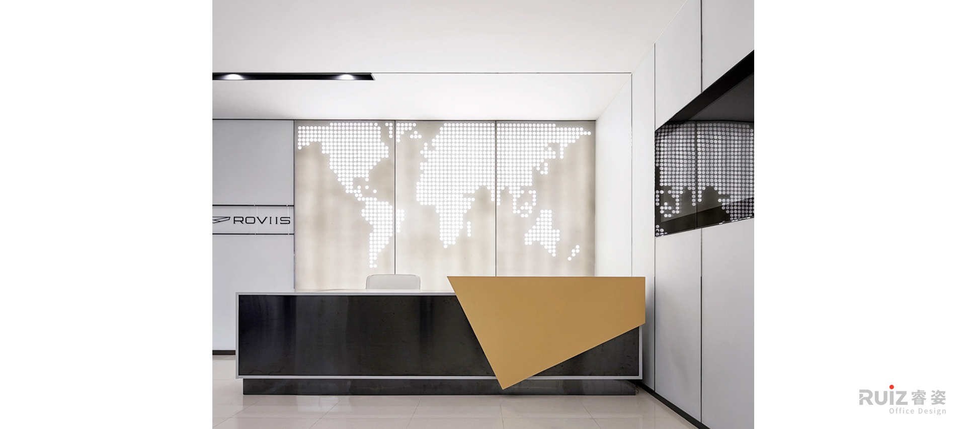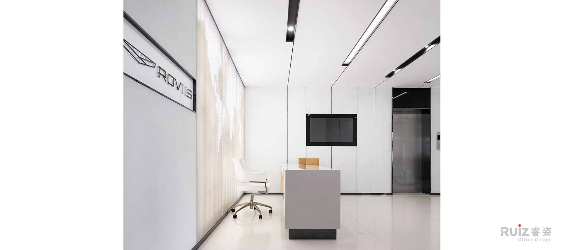 前台: 设计简洁利落,几何形态的接待台既是功能体也是视觉焦点,传递出企业的前卫感,灯光设计保证了基础照明和重点照明。