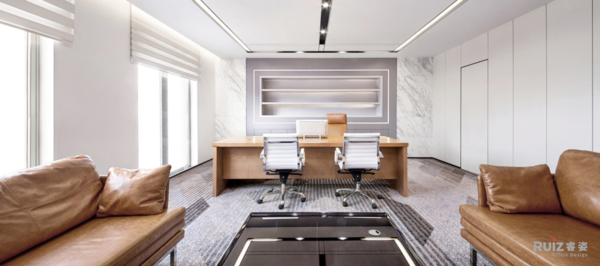 总经理室: 这个区域采用了更柔和的设计手法,舒适的沙发、地毯和温暖的色调营造了一个相对放松的办公氛围。