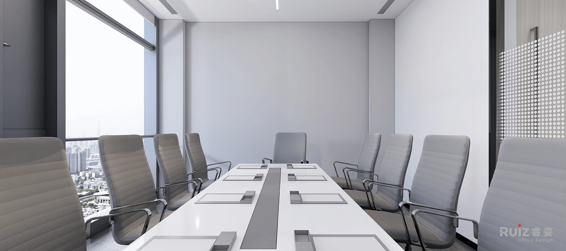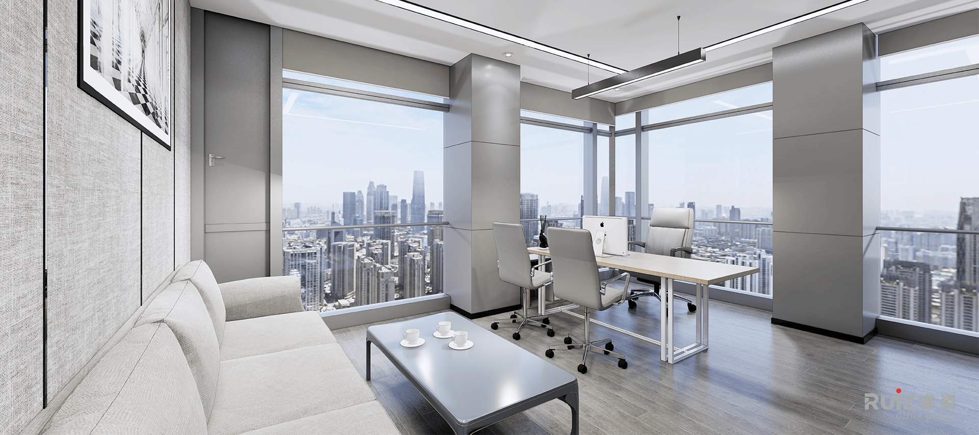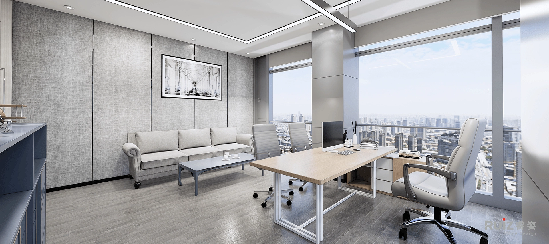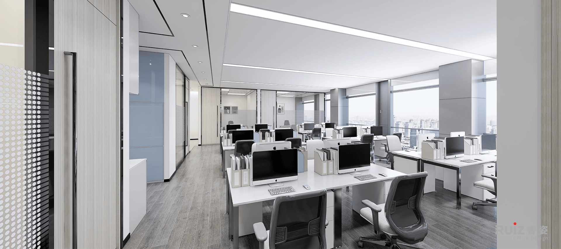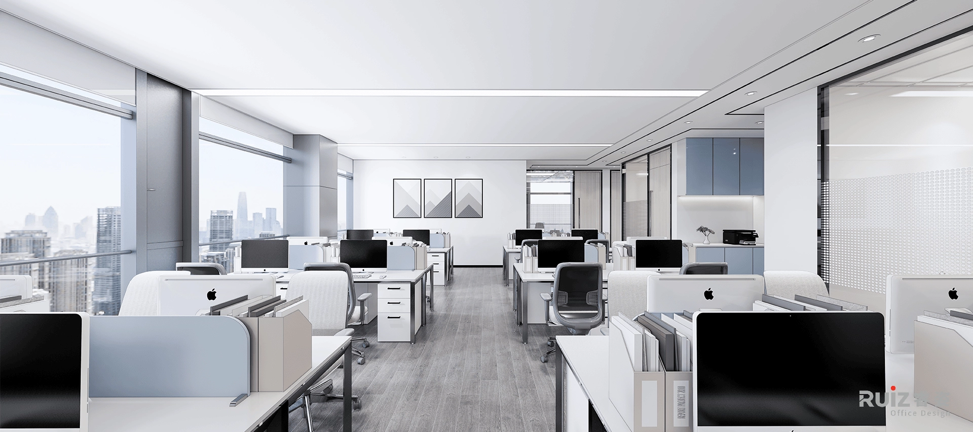 在办公区的设计中,整体以白色、灰色和蓝色为主色调,构建出一个简洁且富有活力的工作空间。白色墙面纯净明亮,最大限度反射光线,让整个区域通透明亮,给人清爽之感,同时为空间奠定简洁大方的基调 。顶面与白色墙面呼应,呈现开阔视觉效果。地面铺设灰色木地板,其柔和中性的灰色调,不仅耐磨实用,还与白色墙面形成自然过渡,增添空间的沉稳质感,使整个办公区氛围趋于宁静,利于员工集中精力工作。而蓝色挡板,蓝色茶水柜等,在白色与灰色的主调中跳跃而出,为办公区注入一抹灵动活力,彰显企业的创新精神与独特个性,也能在一定程度上缓解员工视觉疲劳,提升办公舒适度 。