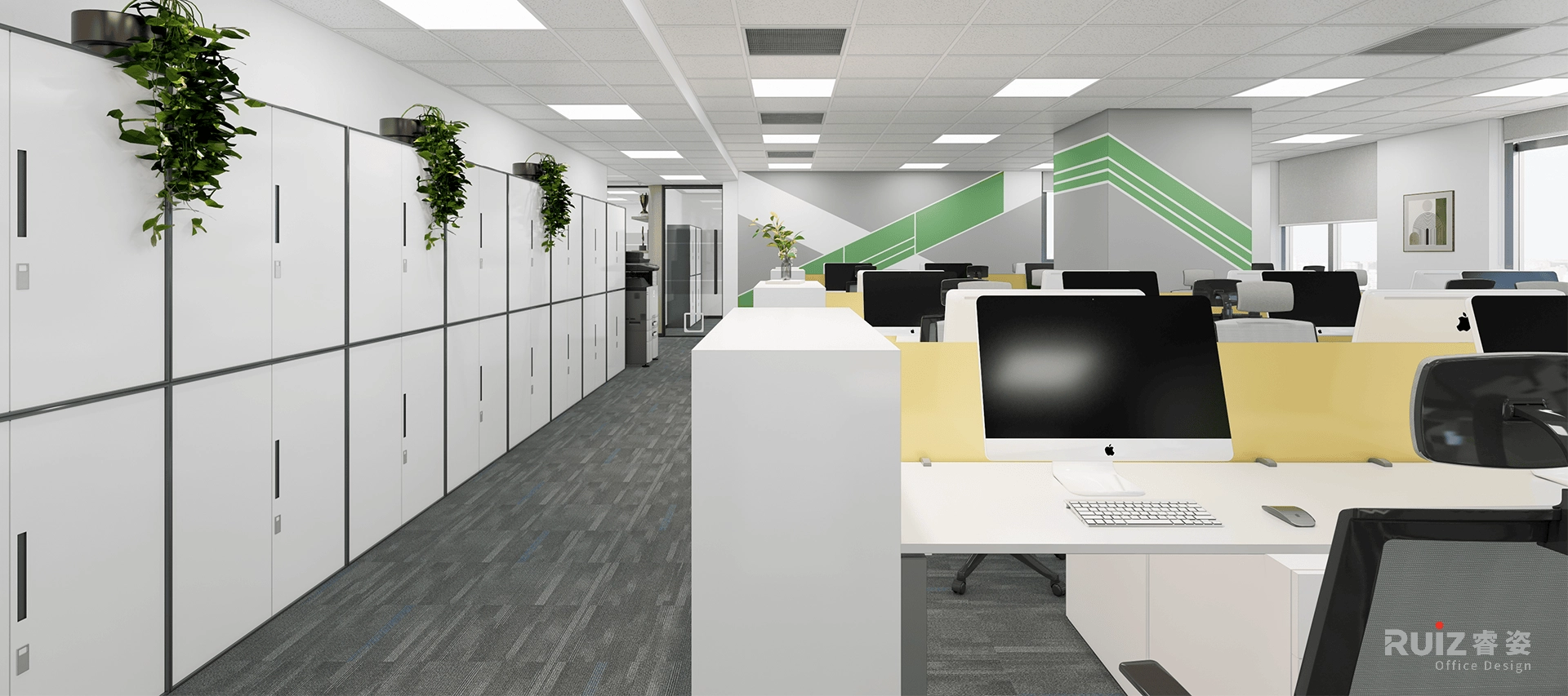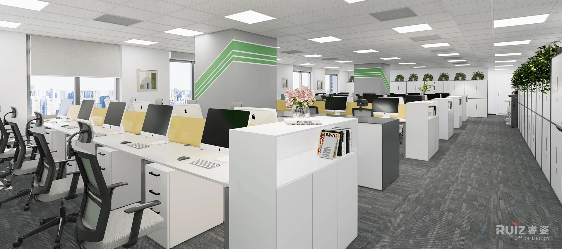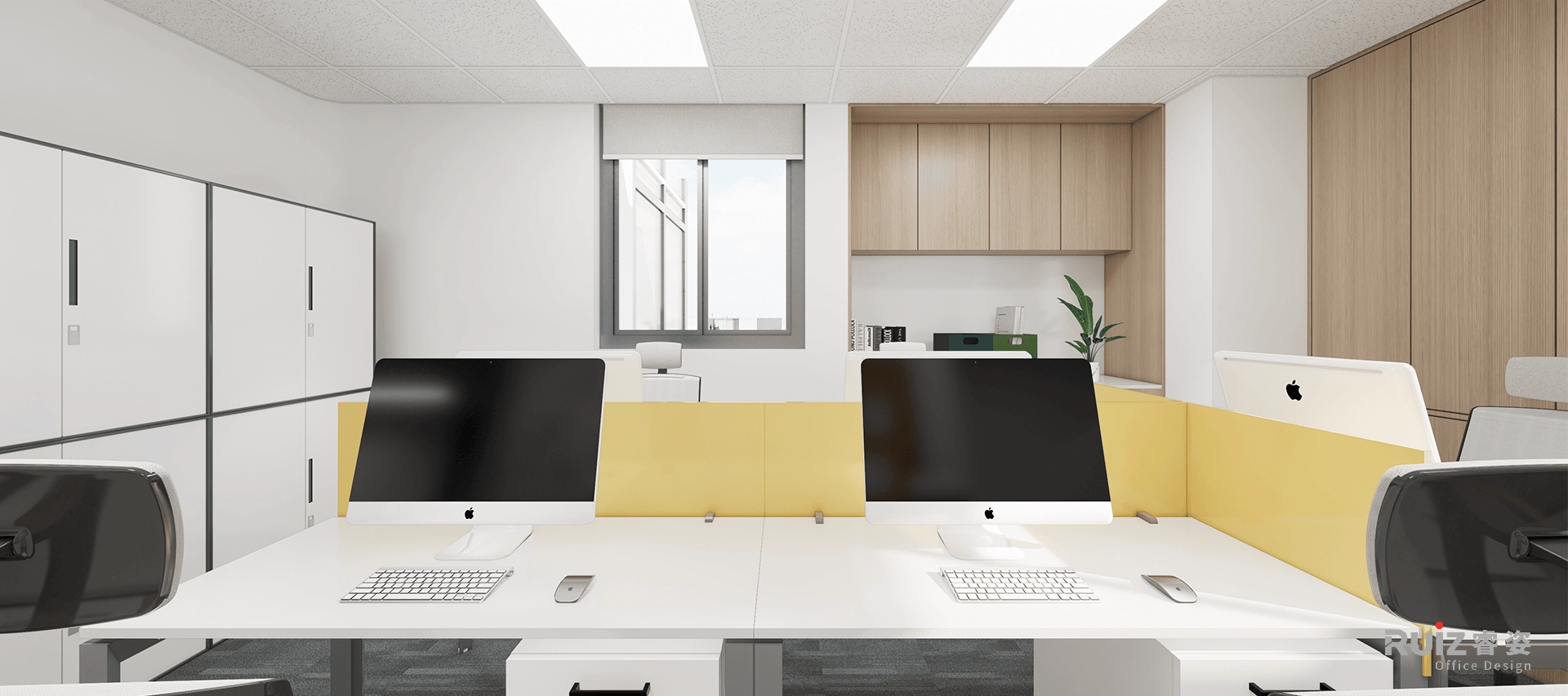 敞开办公区,以矿棉板吊顶、灰色地毯、白色家具以及色彩点缀的墙面为主要元素,构建出简约而富有魅力的空间体验,让员工能够在舒适、愉悦的氛围中高效工作。