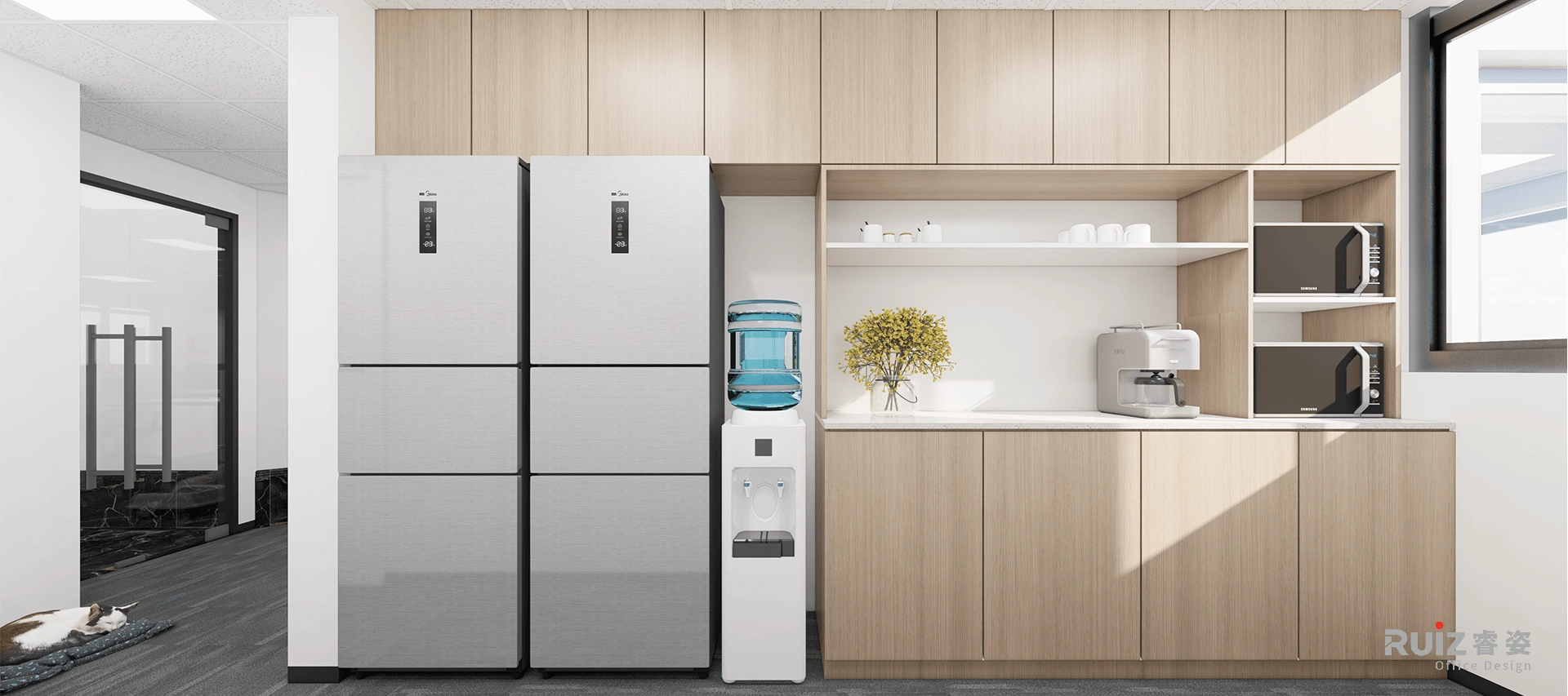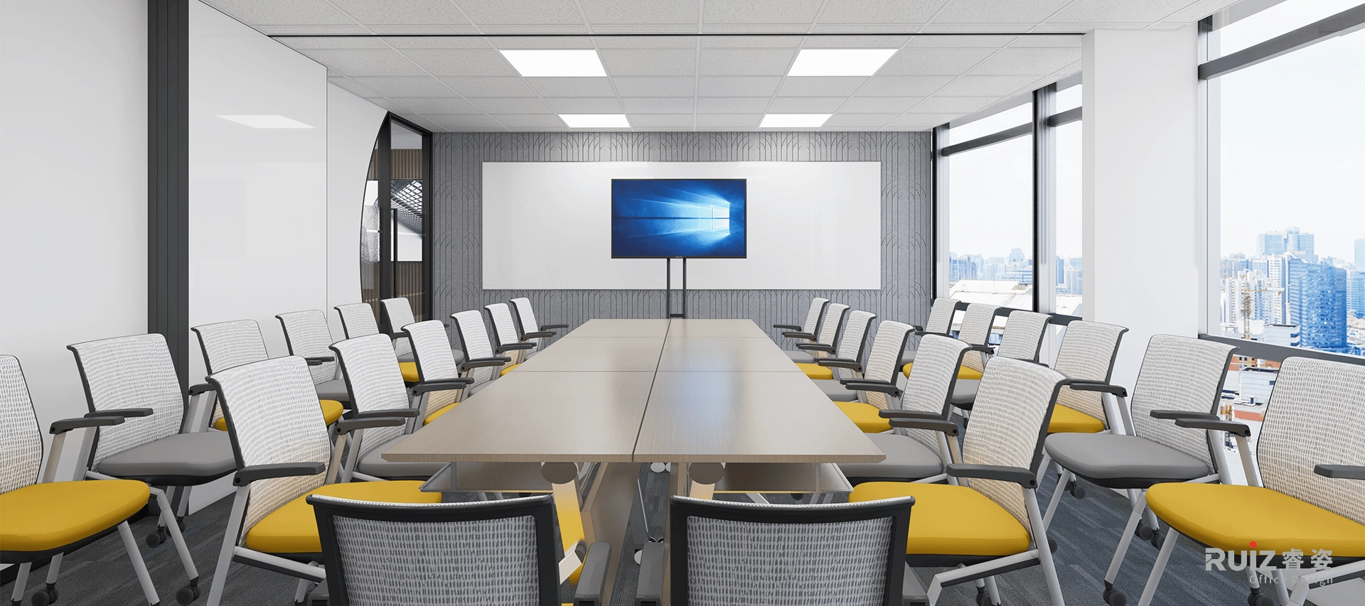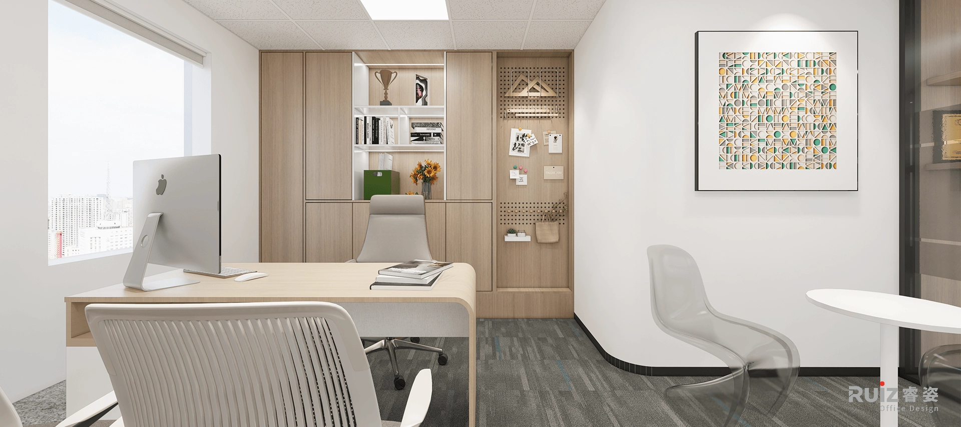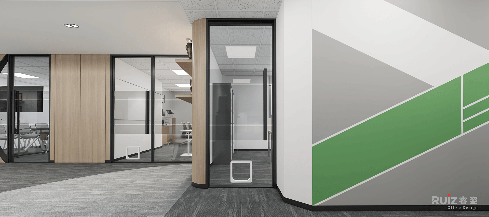 敞开办公区,以矿棉板吊顶、灰色地毯、白色家具以及色彩点缀的墙面为主要元素,构建出简约而富有魅力的空间体验,让员工能够在舒适、愉悦的氛围中高效工作。