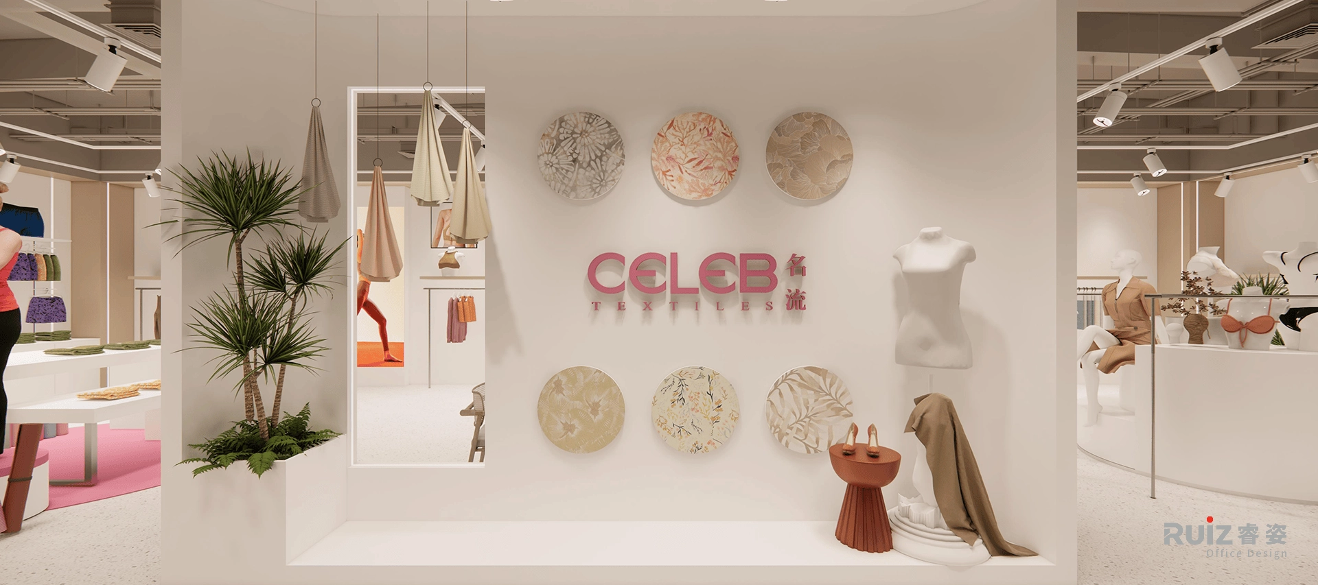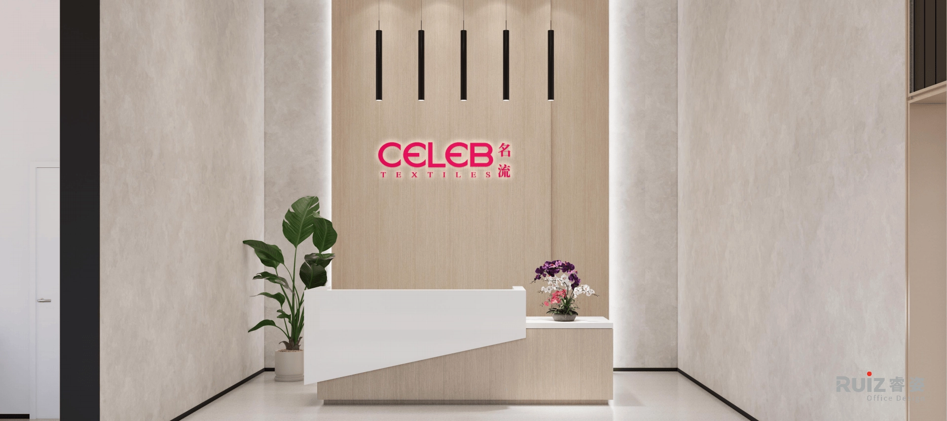 名流品牌专业生产涤氨、锦氨、棉氨汗布,产品主要覆盖各类泳装、时装吊裙的生产制作,定位为内衣类面料及时装类面料的专业供应商。传颂品牌以轻户外运动系列为主,主要有防晒系列、冲锋衣系列、羽绒服系列。该办公空间面积达3900平米,一层为车间,二三层为仓库,四层区域包括传颂展厅、员工休闲区、面料实验室、厨房及员工用餐区,五层区域包括名流展厅、办公区、会议室、茶水区、裁样区。