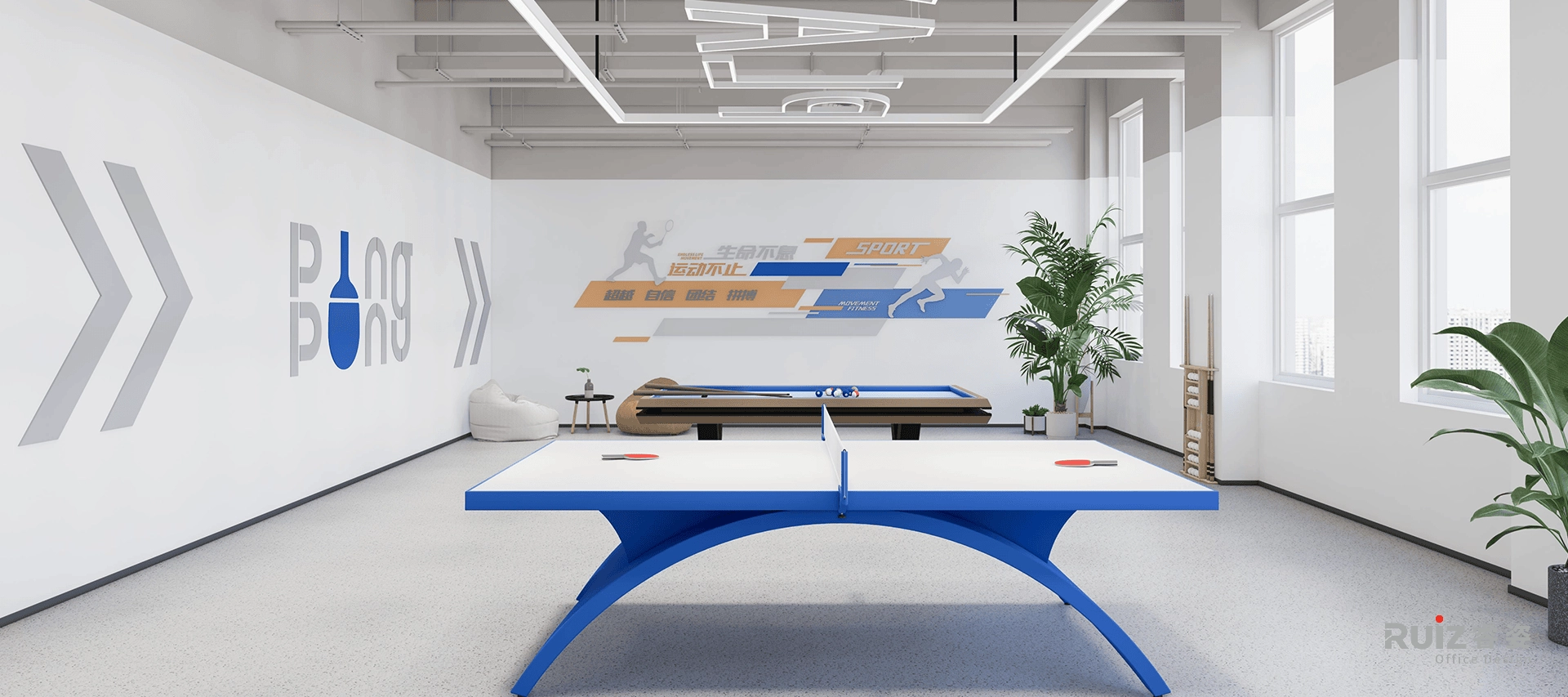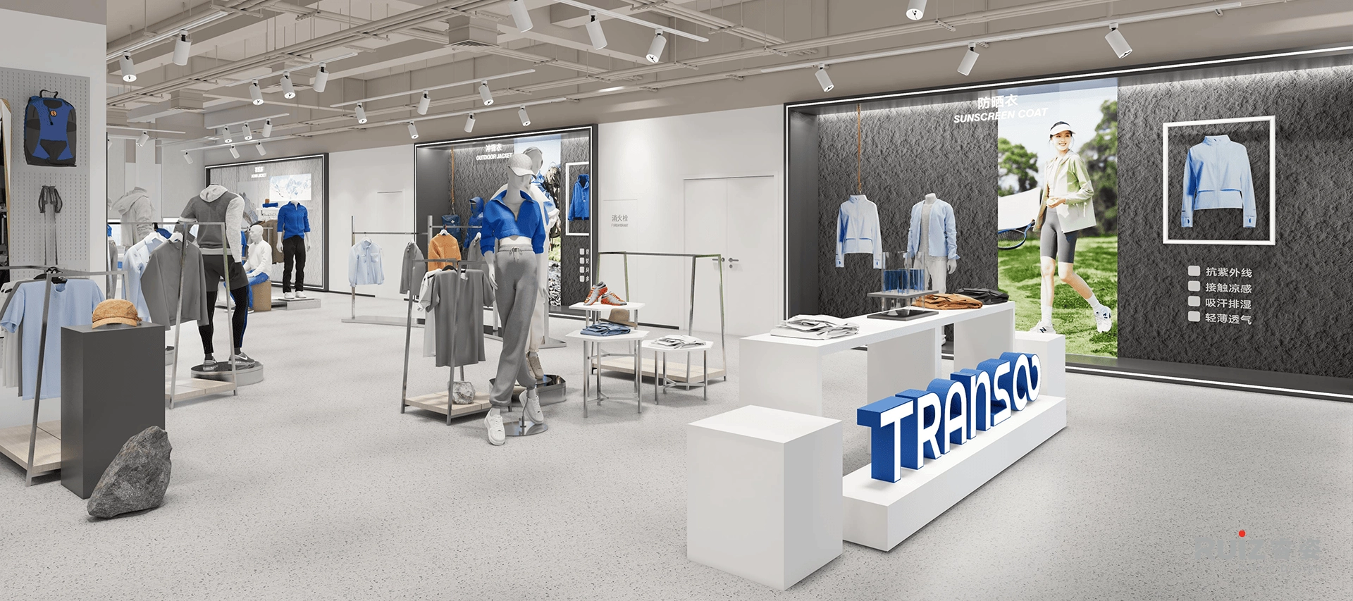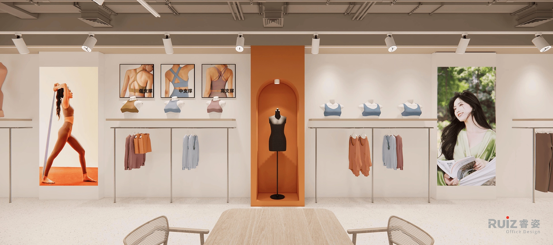 整体风格定位于轻工业风,温馨舒适的配色营造轻松氛围。四层传颂展厅以品牌蓝色为主色调,跃动活力。不同服装系列错落有致,尽显运动风采。中心区域作为灵活展示区,样衣样布随心搭配,呼应不同时期的宣传主题。全厅采用可活动家具,布局变换自如。
