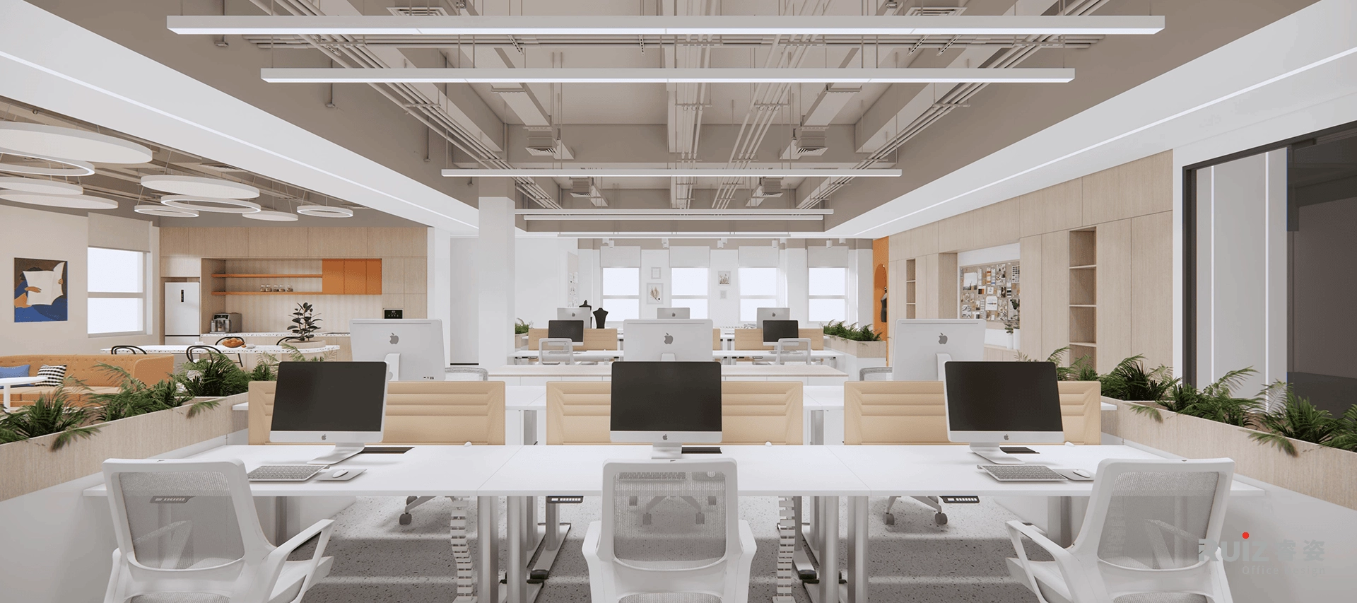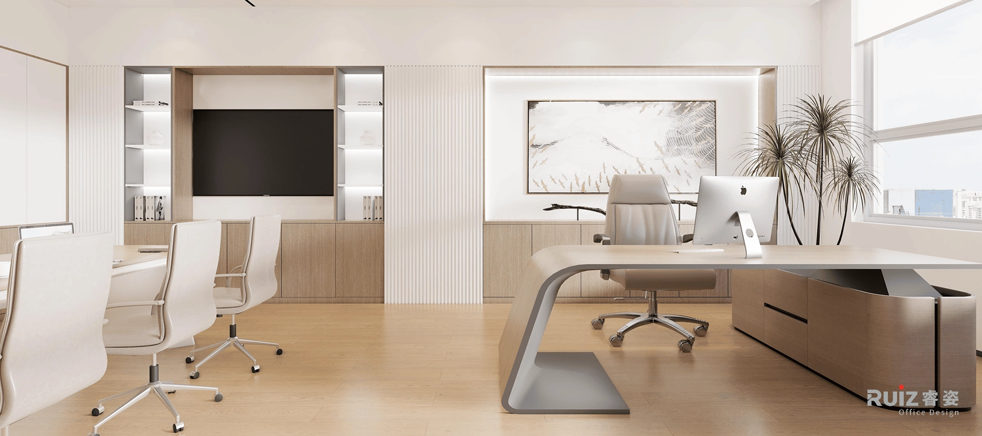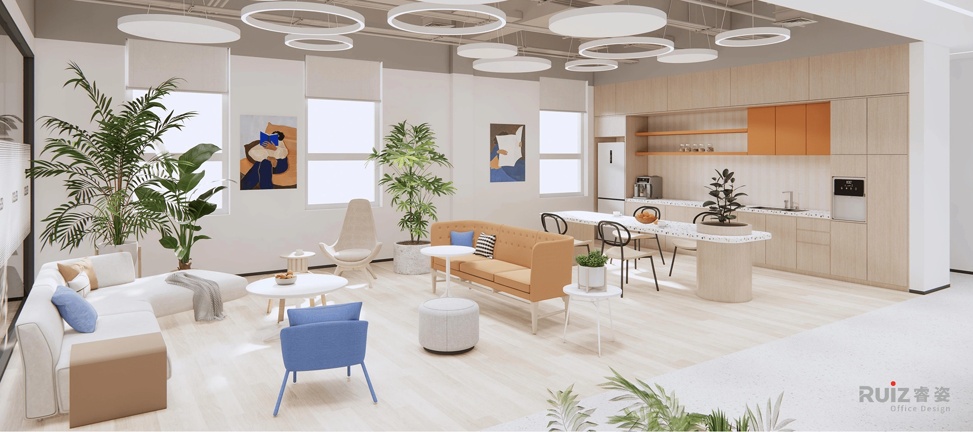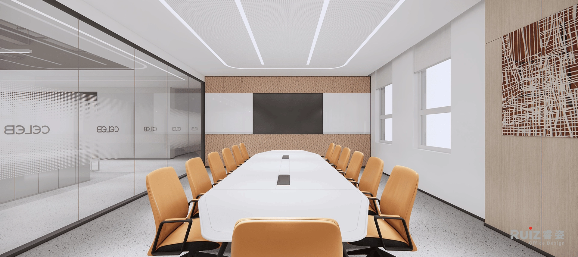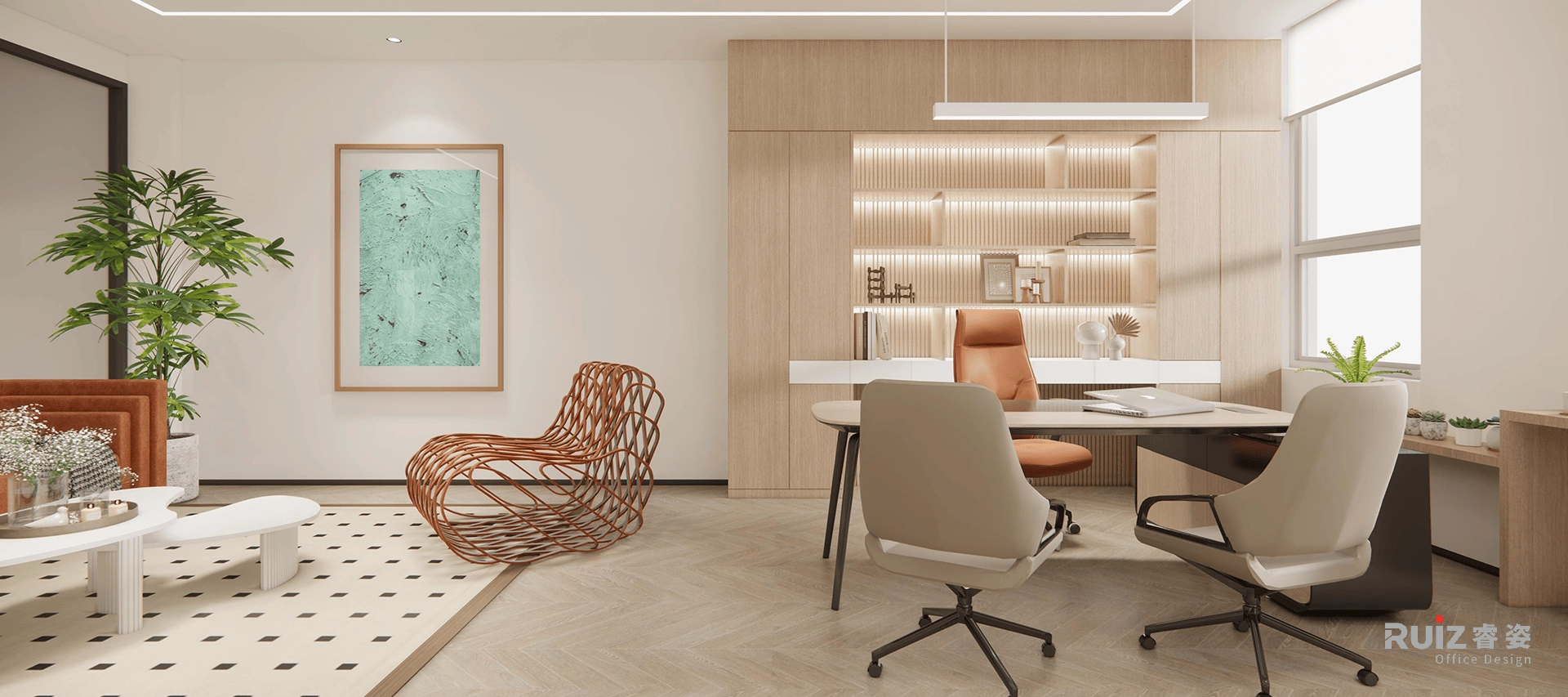 五层的名流展厅则以温暖橙色为主旋律,打造舒适体验。多元化的展示形式,并考虑大量的样布展示区,满足不同场景需求。开放办公区更选用可升降办公桌,关怀员工的每一寸舒适。副总室巧妙融入橙色点缀,于细节处彰显女性的柔美。总经理室打破传统,摒弃背柜设计,以大面积展示墙搭配纯净的白色格栅板,呈现开阔明亮的视觉效果,尽显大气风范。