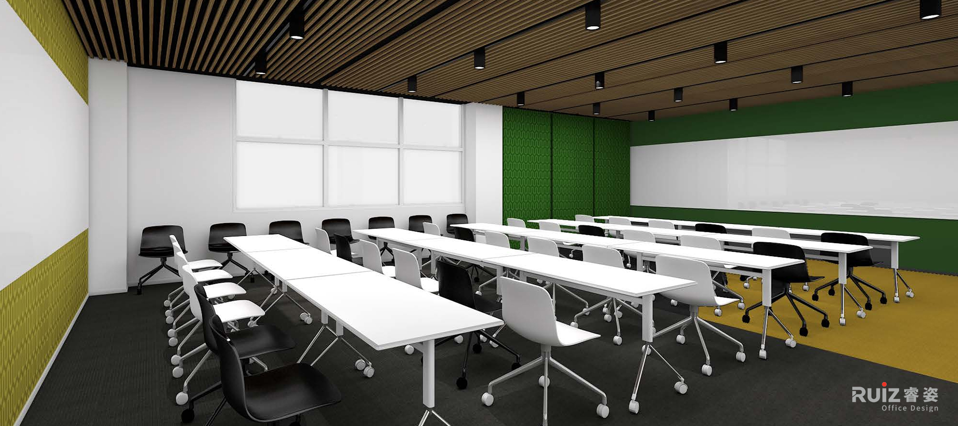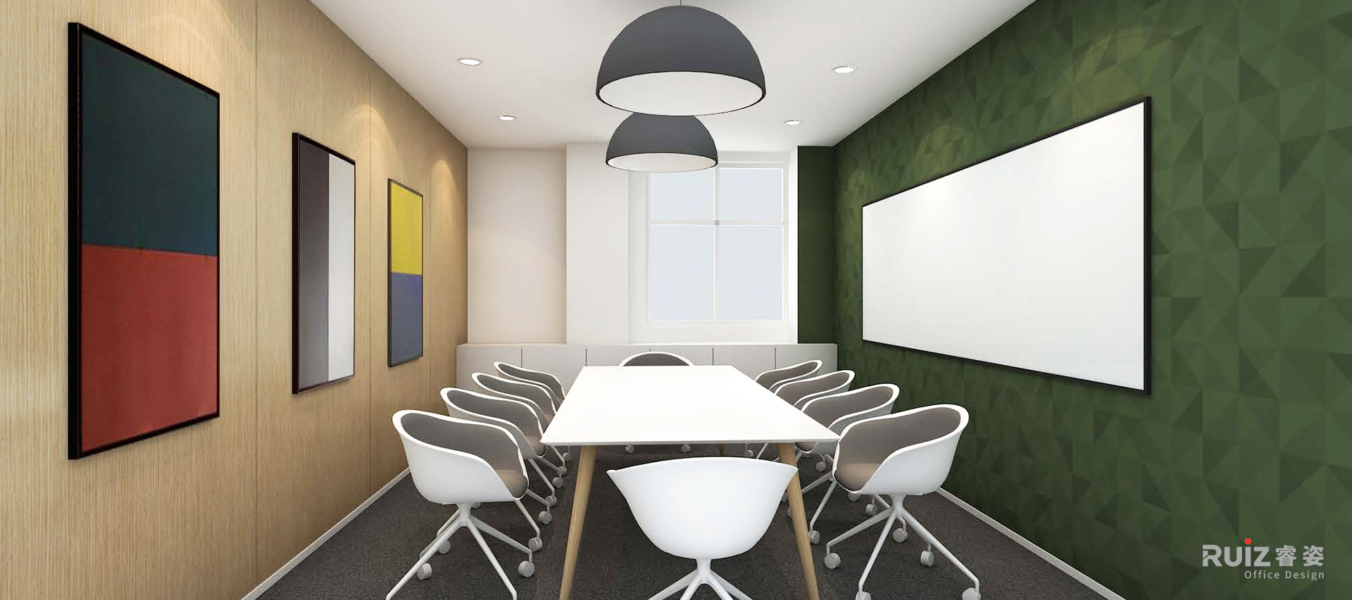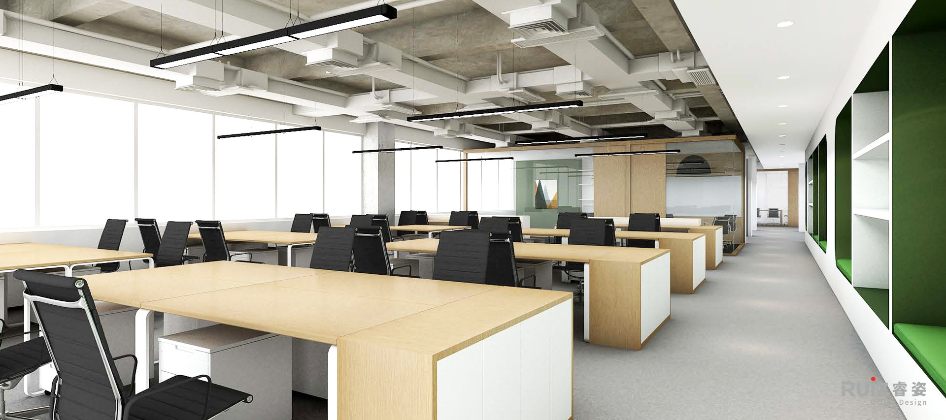 二层会议室采用通透的玻璃隔断,最大化引入自然光线,而楼梯区精选的黑色纹理大理石背景墙,则成为空间中的艺术焦点。开放办公区以中性色为基底,木饰面增添温暖质感,局部点缀的企业标准色绿与蓝,既呼应流体行业的特性,又为严谨的工作氛围注入活力。