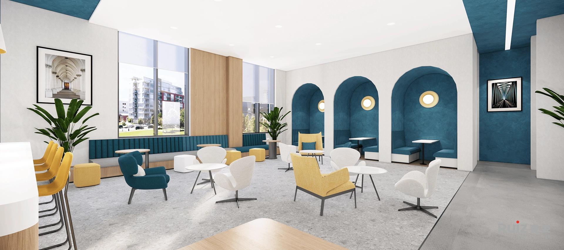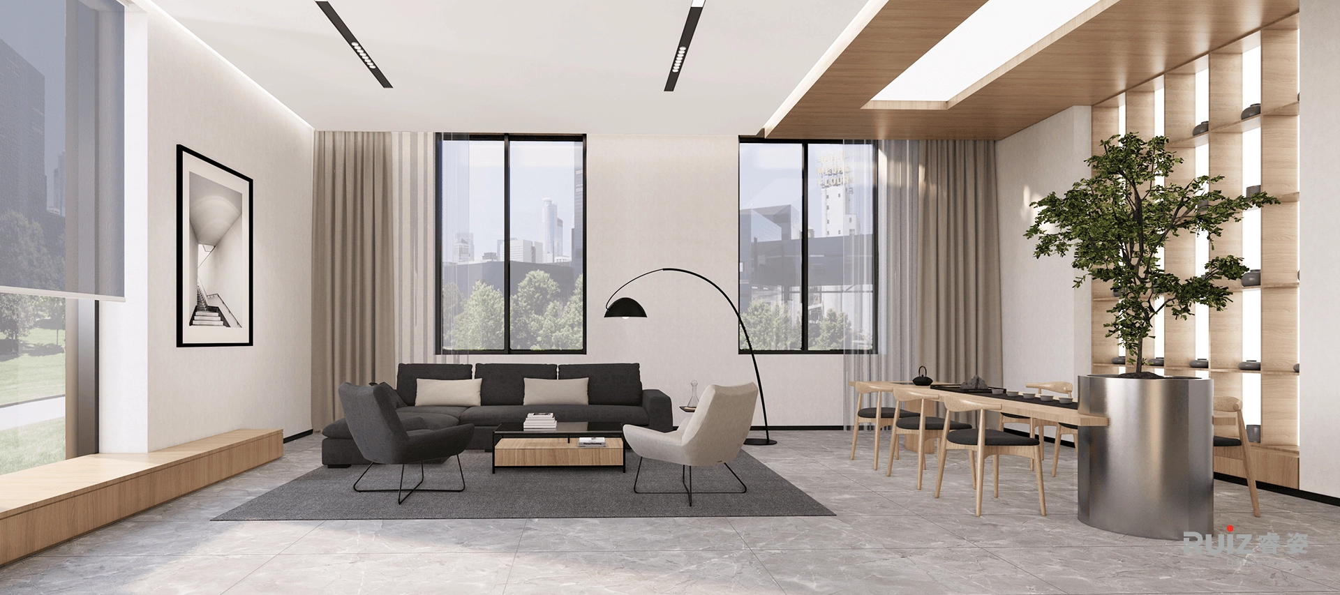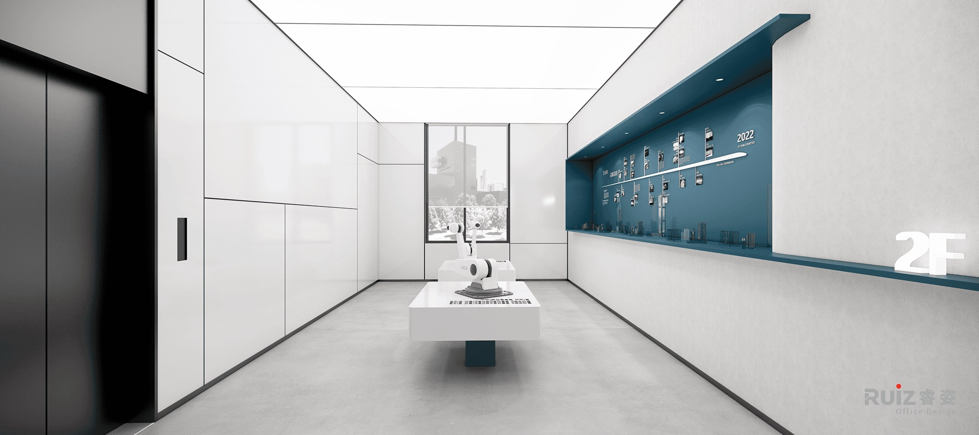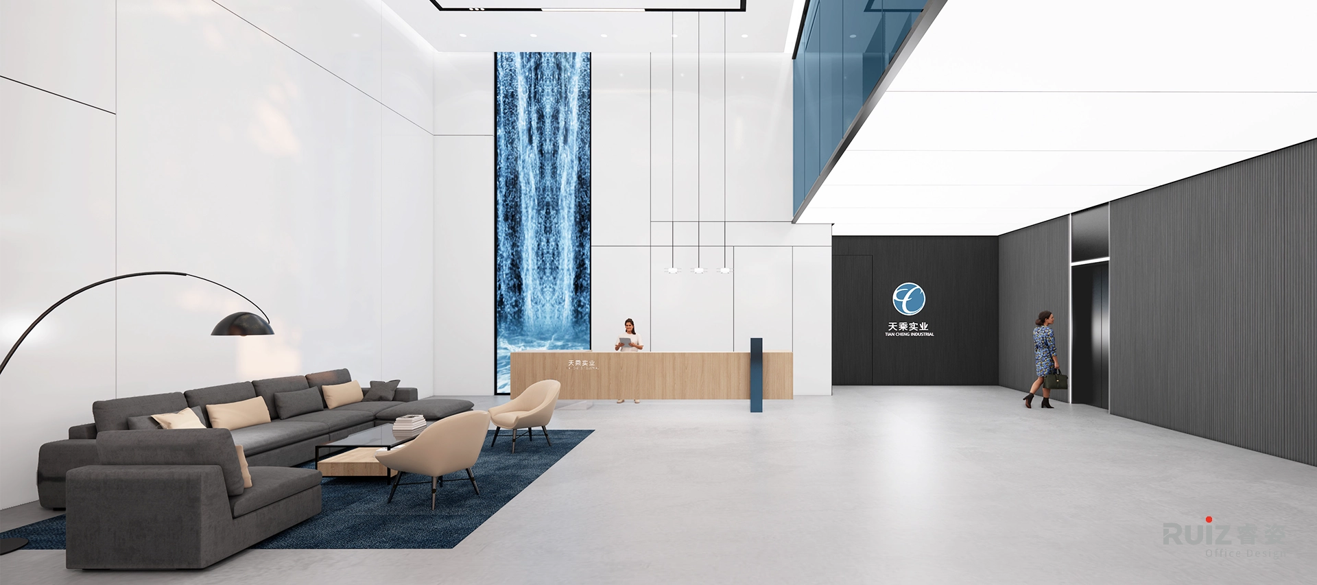 本次设计为天乘实业总部大楼,接待大厅采用挑高式空间设计,通过超高尺度的背景墙与巨幅电子屏形成强烈的纵向视觉延伸,配合二楼的蓝色玻璃幕墙营造出极具冲击力的空间焦点。白色主墙面与灰色抛光地砖构成干净利落的背景基调,木纹材质的前台设计在冷色调中注入自然温润感。顶部采用石膏板与软膜天花的吊顶系统,通过不同材质的组合与灯光设计,塑造出丰富的空间层次感。深色布艺沙发接待区与整体环境形成鲜明对比,既保证了商务接待的庄重感,又提供了舒适的交流氛围。