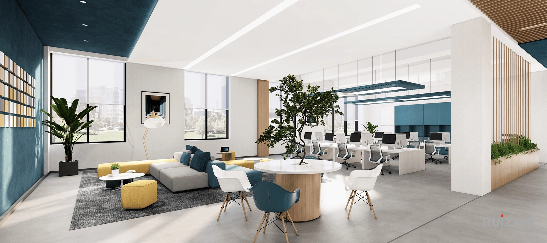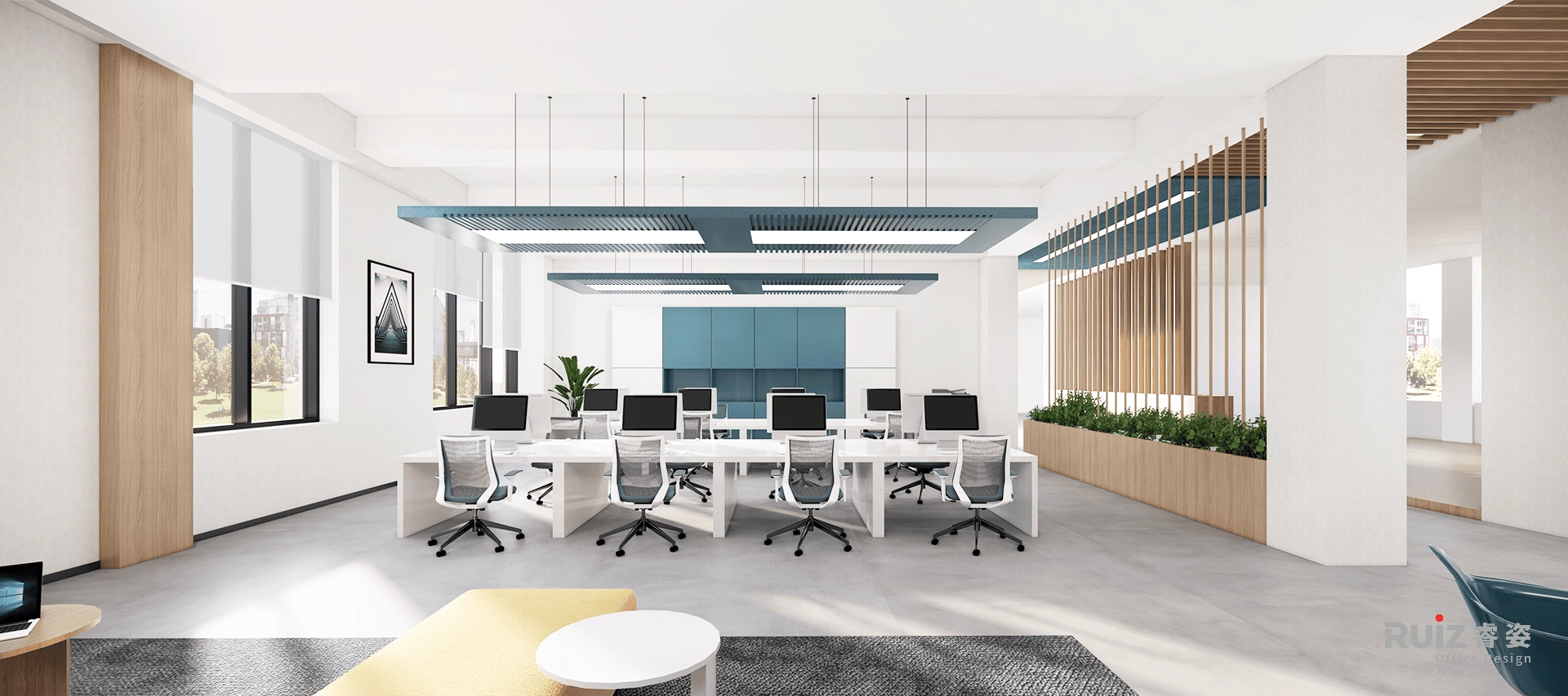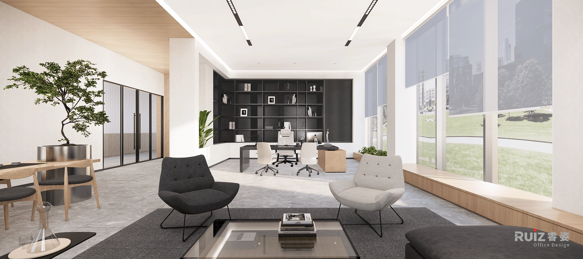 办公区域采用开放式布局,白色墙面搭配蓝色装饰饰面与木色装饰及家具,在保持空间明亮通透的同时,通过色彩对比增强视觉活力。总经理室整合了办公、会客与品茶三大功能,黑色办公家具与灰色墙面体现商务质感,原木茶台与皮质沙发则提升了空间温度。展厅区域采用极简设计语言,通过软膜天花照明突出展品特性,确保展示效果的专业性。各功能分区通过造型吊顶与地面材质变化进行自然区隔,既保持空间连贯性又确保功能独立性。