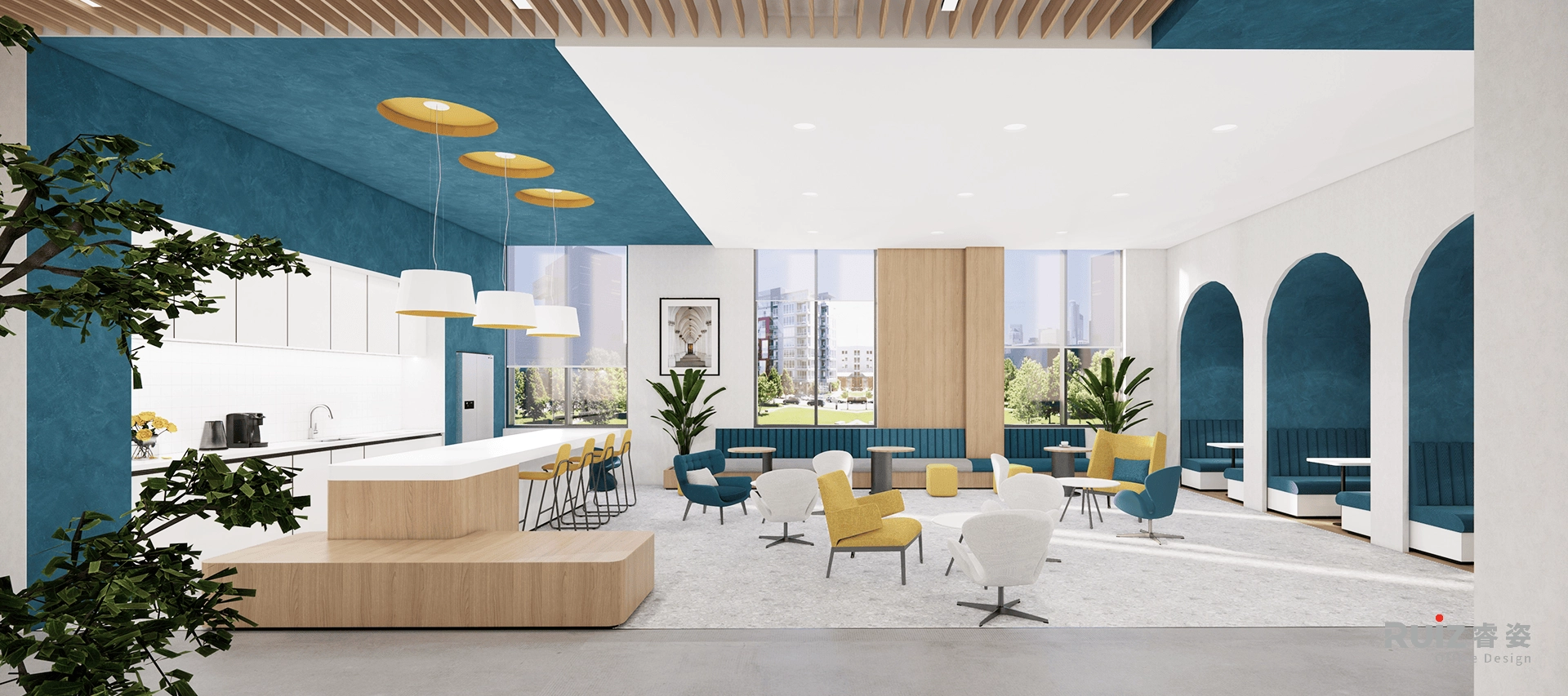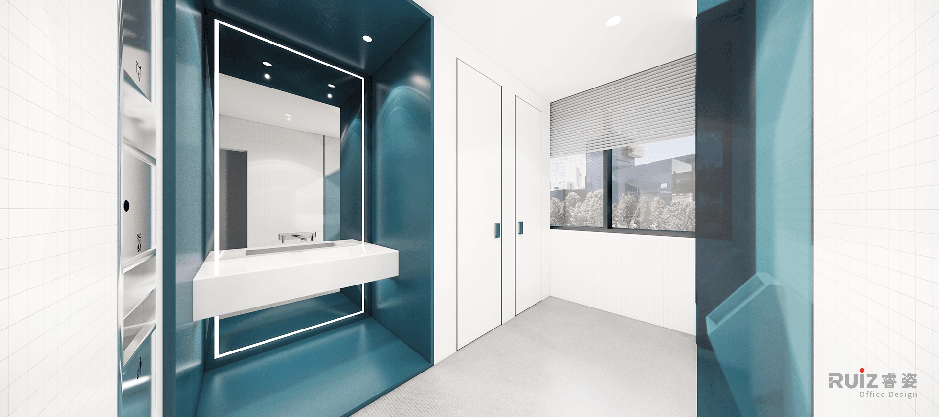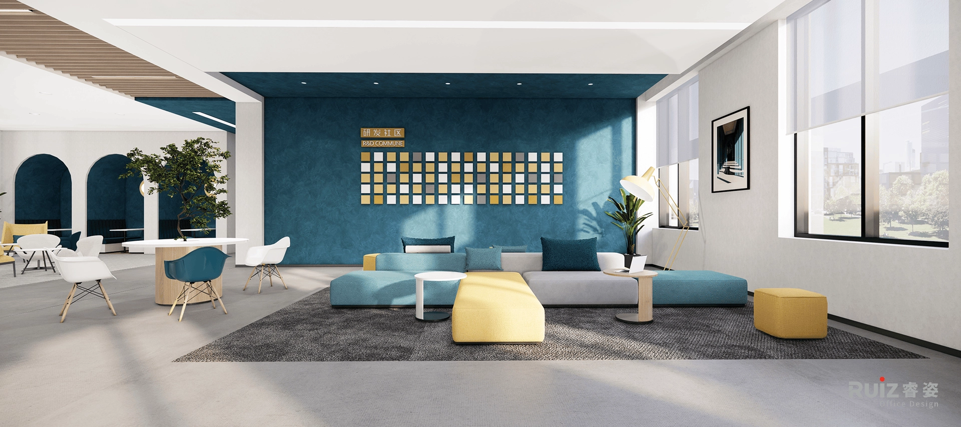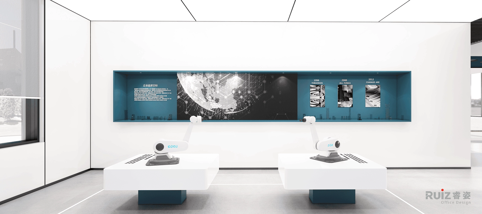 办公区域采用开放式布局,白色墙面搭配蓝色装饰饰面与木色装饰及家具,在保持空间明亮通透的同时,通过色彩对比增强视觉活力。总经理室整合了办公、会客与品茶三大功能,黑色办公家具与灰色墙面体现商务质感,原木茶台与皮质沙发则提升了空间温度。展厅区域采用极简设计语言,通过软膜天花照明突出展品特性,确保展示效果的专业性。各功能分区通过造型吊顶与地面材质变化进行自然区隔,既保持空间连贯性又确保功能独立性。