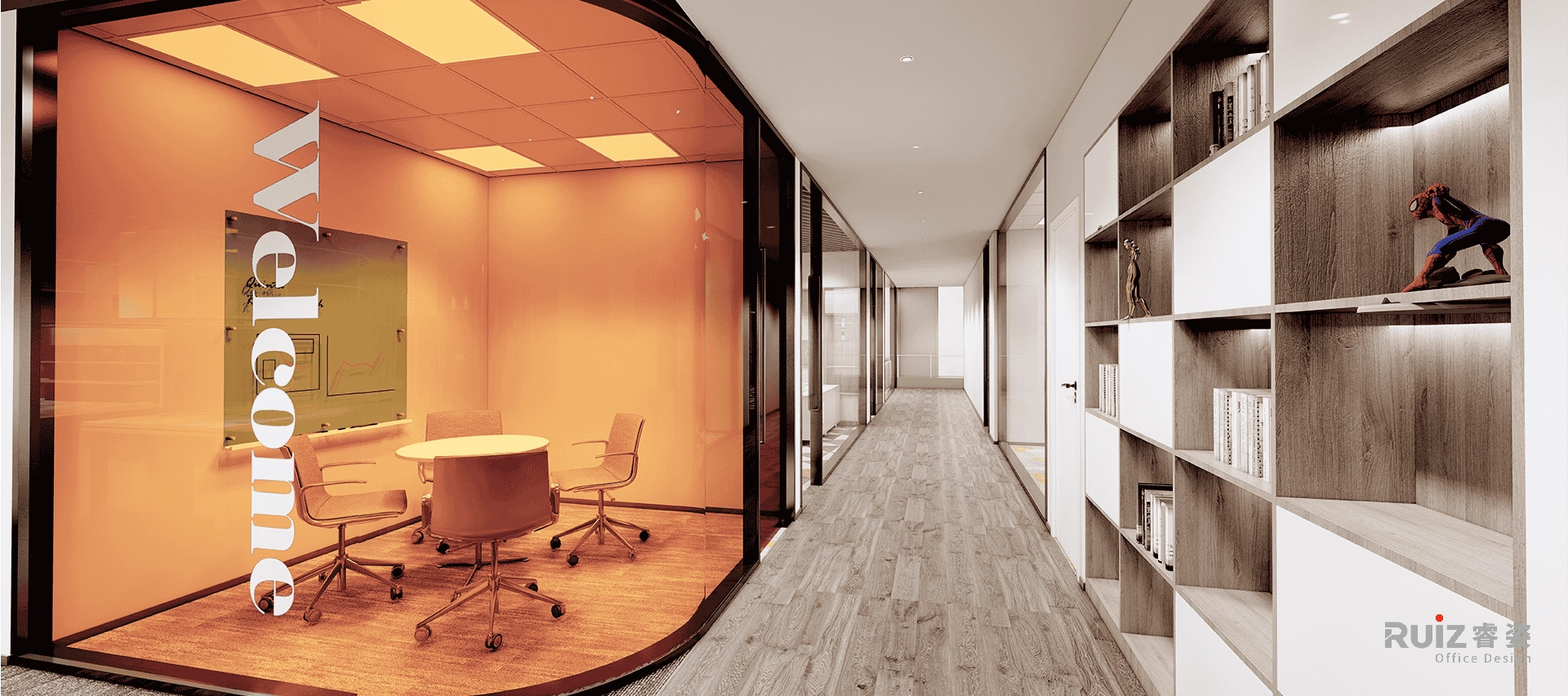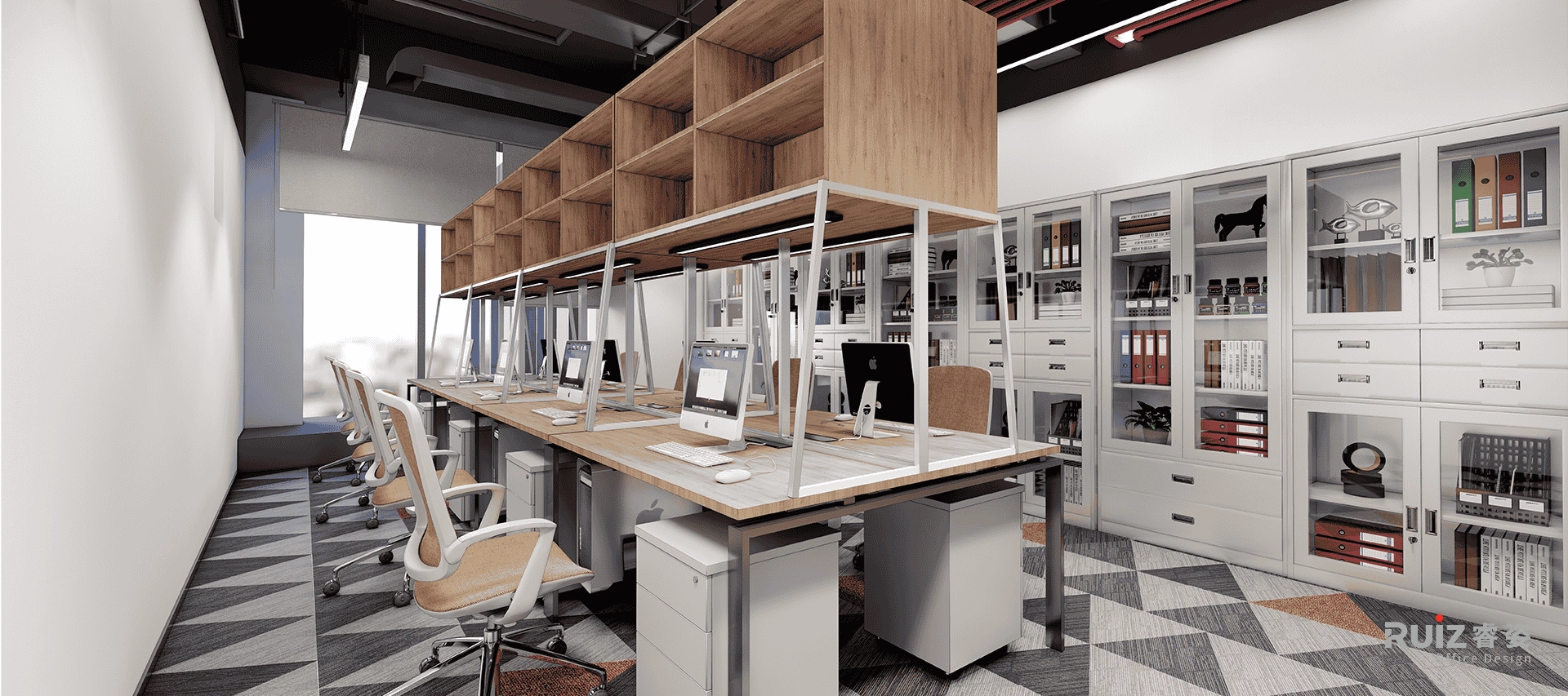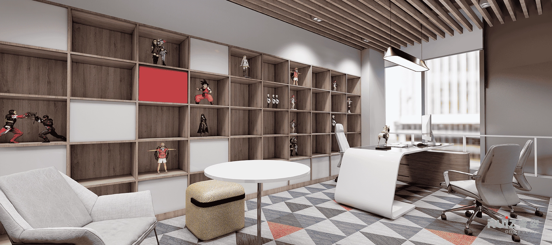 敞开办公空间以工业风为基底,裸顶喷涂深灰色漆面,整合管线并保留原始结构肌理,顶部穿插红色几何装饰管(沿动线或功能区排布),形成视觉冲击点与品牌色呼应。办公区采用开放式布局,工位搭配模块定制桌,地面铺设拼色地毯,既划分协作单元又提升舒适度。过道通铺浅木纹地板,串联各区域并增添自然暖意;墙面设置格子展示储物柜,层板嵌入LED灯带,陈列手办、书籍或绿植,兼具功能与潮玩展示性。