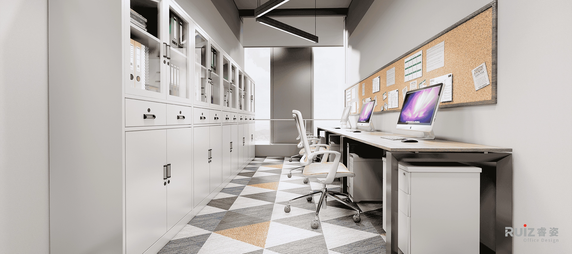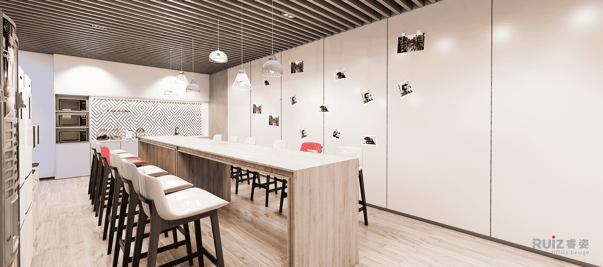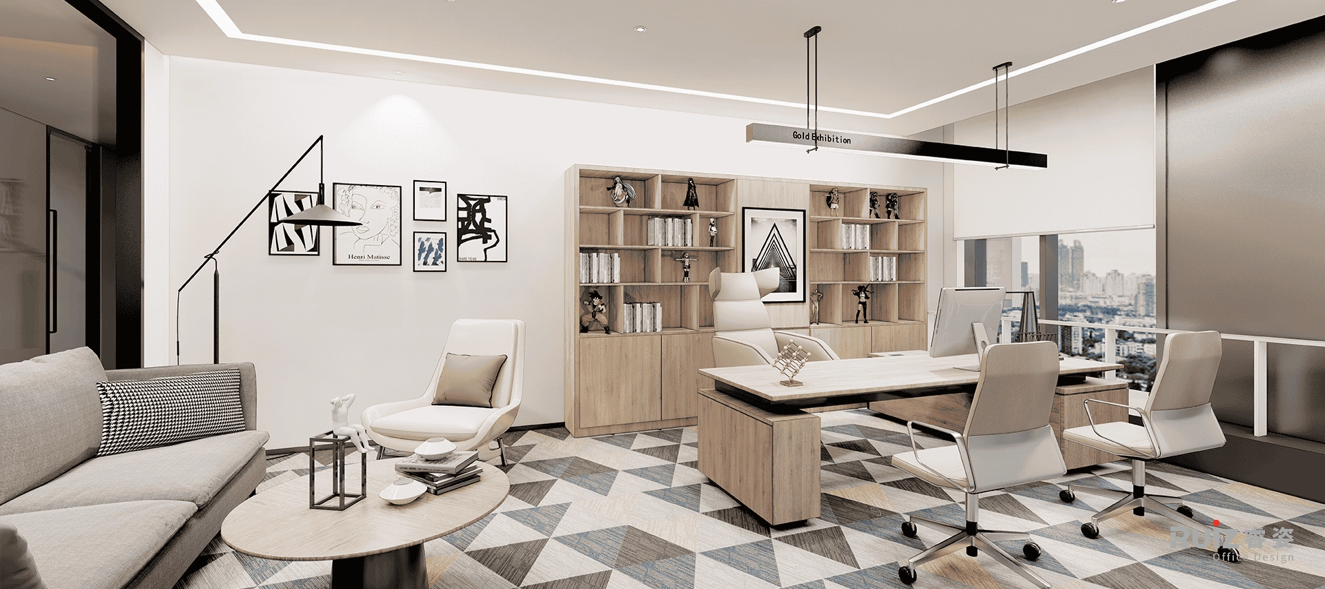 敞开办公空间以工业风为基底,裸顶喷涂深灰色漆面,整合管线并保留原始结构肌理,顶部穿插红色几何装饰管(沿动线或功能区排布),形成视觉冲击点与品牌色呼应。办公区采用开放式布局,工位搭配模块定制桌,地面铺设拼色地毯,既划分协作单元又提升舒适度。过道通铺浅木纹地板,串联各区域并增添自然暖意;墙面设置格子展示储物柜,层板嵌入LED灯带,陈列手办、书籍或绿植,兼具功能与潮玩展示性。