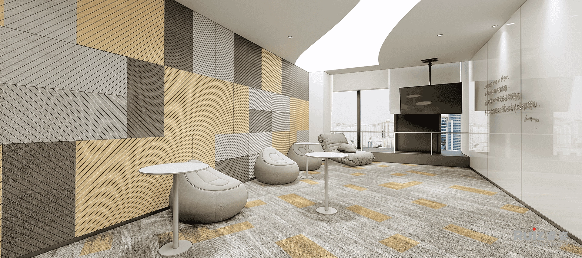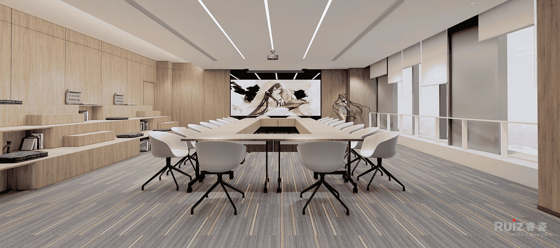 大会议室以极简石膏板平顶为基础,边缘嵌入隐藏式灯带,搭配条形深灰哑光筒灯,形成柔和均匀的照明;地面通铺灰白条纹地毯,视觉延展空间同时强化吸音功能。核心区设模块化拼接会议桌(哑光木纹桌面+金属框架),可灵活组合适应不同会议规模,侧方打造阶梯式木质休闲座区(搭配软垫),兼作非正式讨论角。背景墙采用黑色哑光玻璃饰面,嵌入式超窄边框大屏电视,整体以黑白木为主调,穿插绿植点缀,平衡理性效率与人文温度,打造兼具协作弹性与美学张力的现代会议空间。