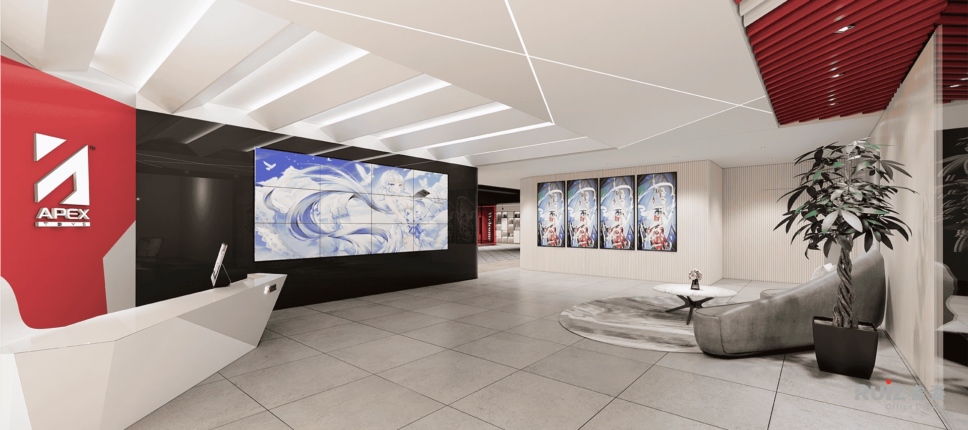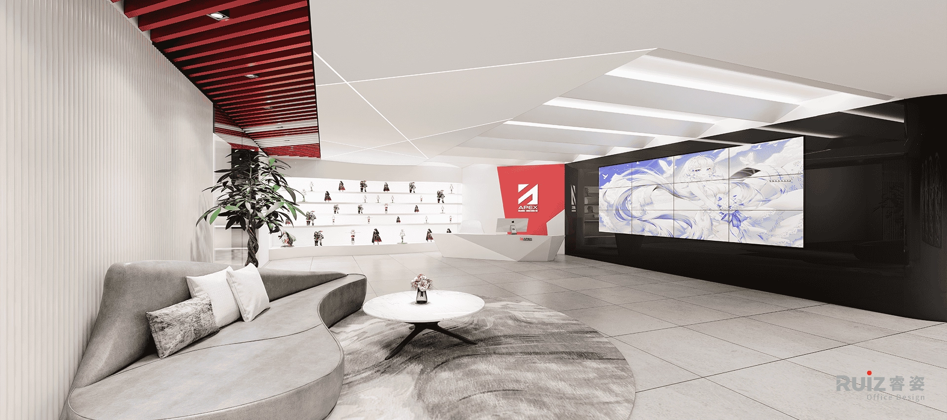 湃思手办办公室以前卫潮玩基因破圈,入口以超大异形LED屏与黑色哑光饰面板形成视觉爆破点,搭配流线型3D打印前台与流线型手办展格,瞬间点燃品牌辨识度。多元化吊顶贯穿解构美学进行交织,构建“二次元顶幕”的沉浸张力。接待区以低饱和布艺沙发、四扇数字屏营造轻松社交场景,整体以赛博朋克美学为核,黑白灰基底碰撞荧光色跳跃,于工业质感中注入潮流灵魂,打造集办公、展示与社群共创于一体的未来式潮玩文化据点。