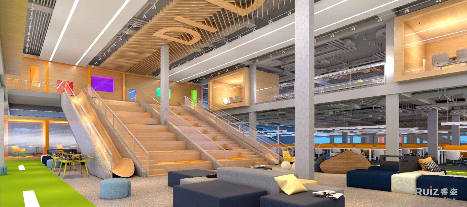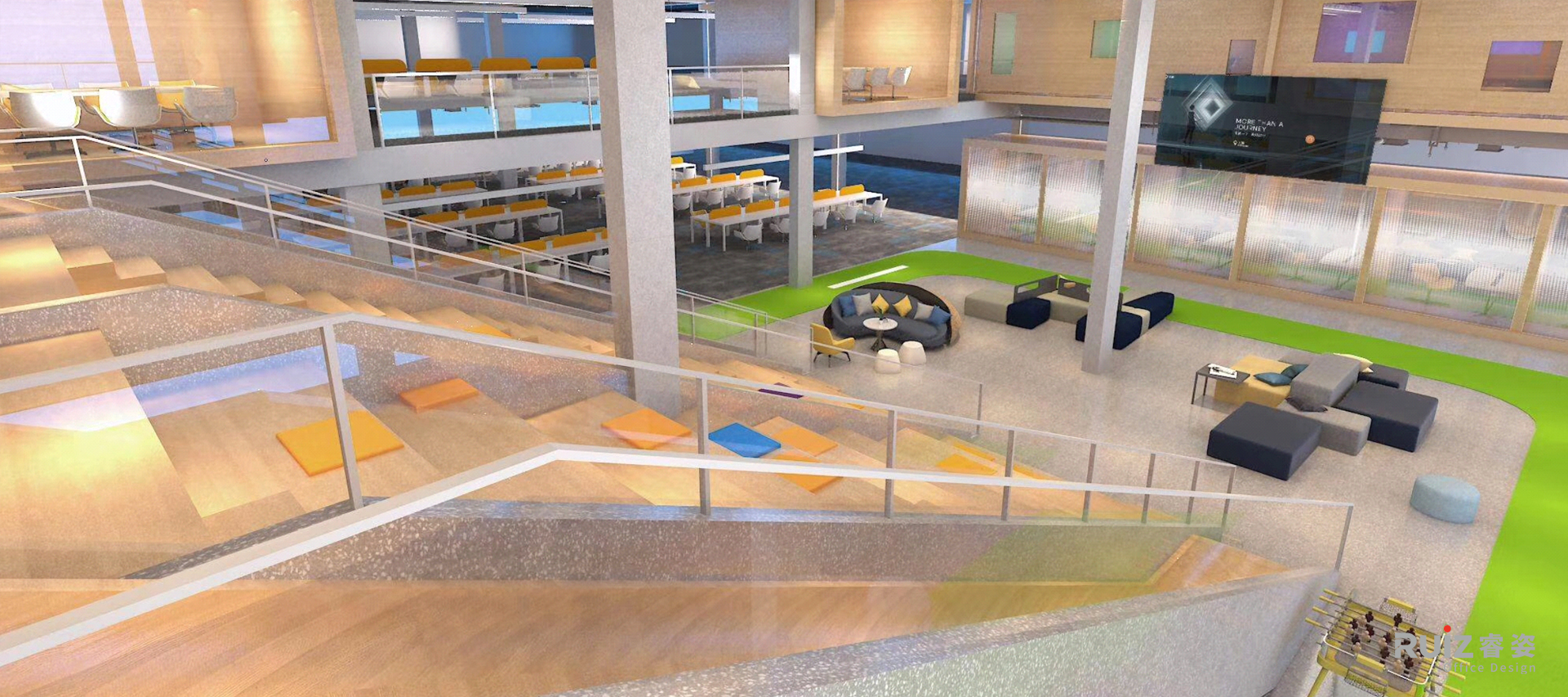 大型多功能台阶成为空间的点睛之笔,既连接两层办公区优化动线,又融合休憩、社交和临时办公功能,结合嵌入式灯光和绿植,打造兼具实用性与美感的共享空间。