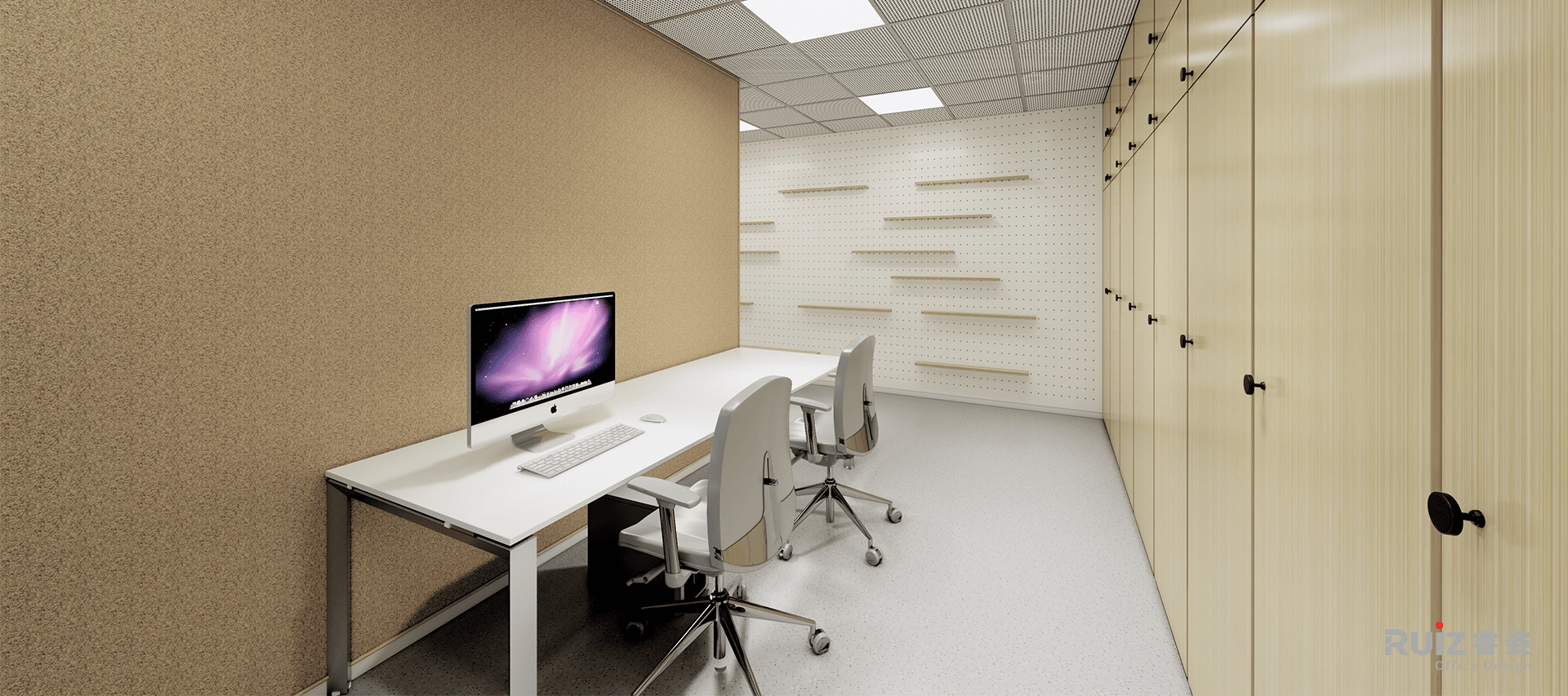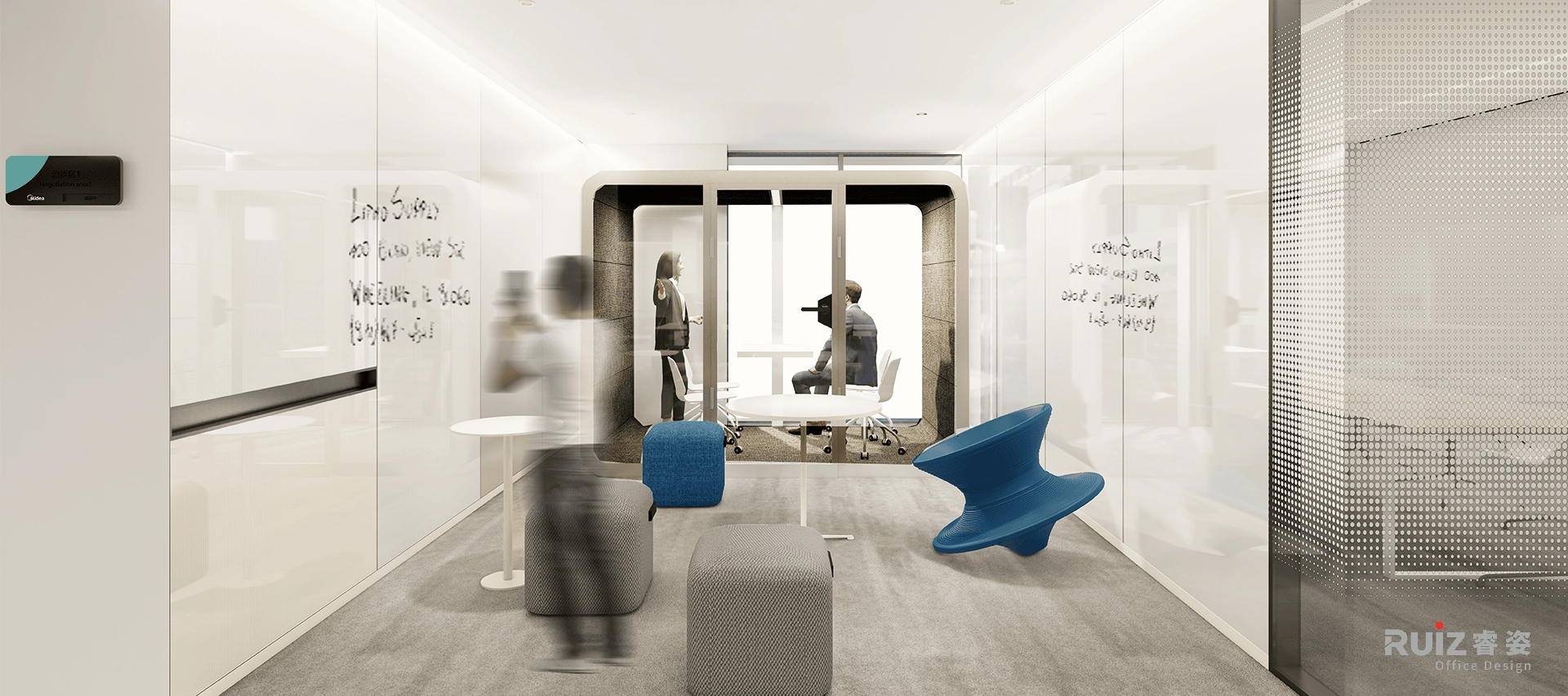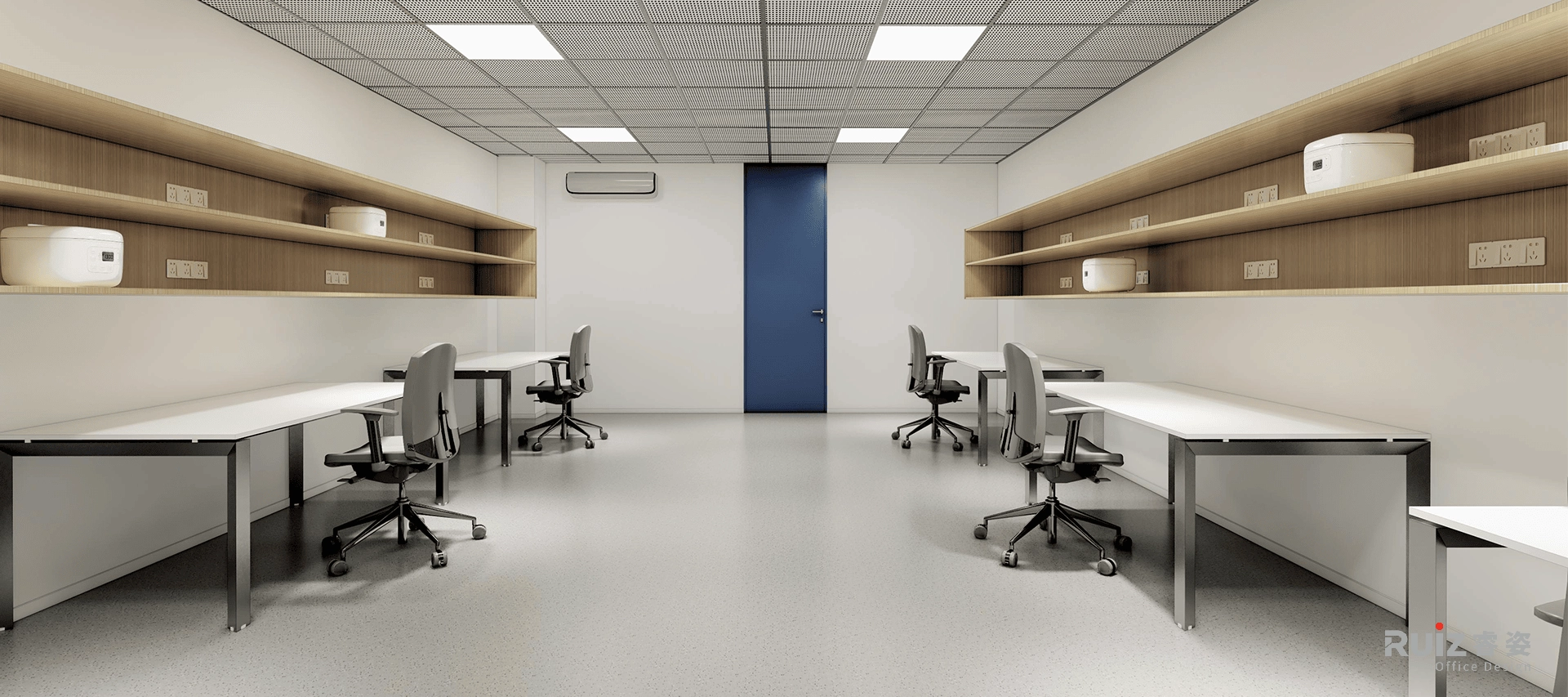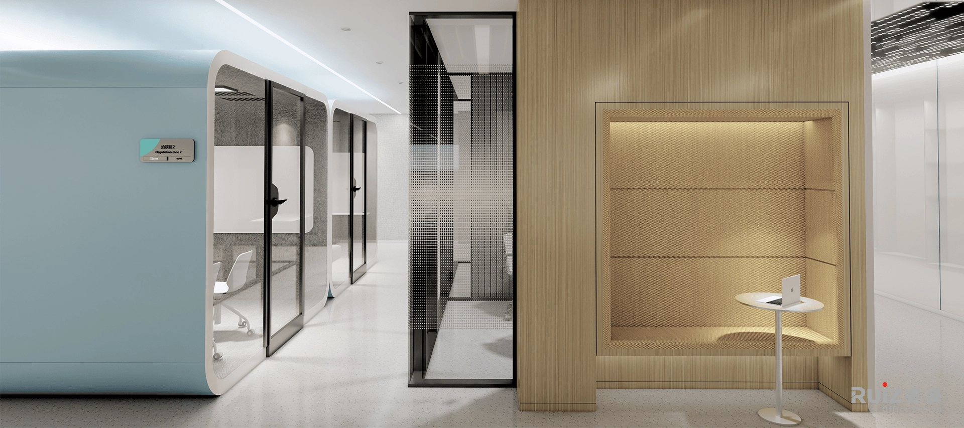 本项目划分为两个核心区域:办公区与实验室集群。办公区设置了开放式办公区、会议区、讨论区、员工休闲区,并精心配置电话间与冥想空间,以满足多样化工作场景需