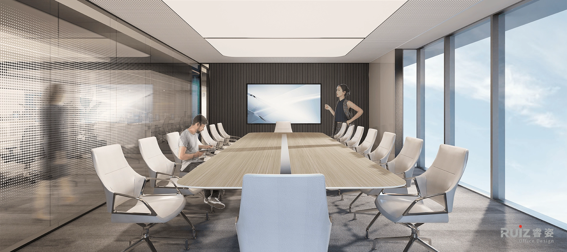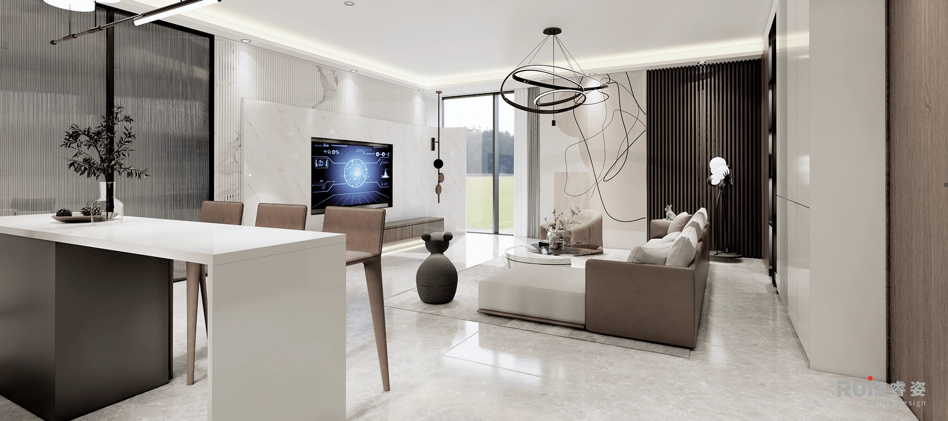 办公区及会议区配置智能会议预约系统与智慧显示大屏,提升会议效率与信息透明度,实现空间与技术的无缝协同,局部区域设置智能照明与环境调节系统,根据使用者行
