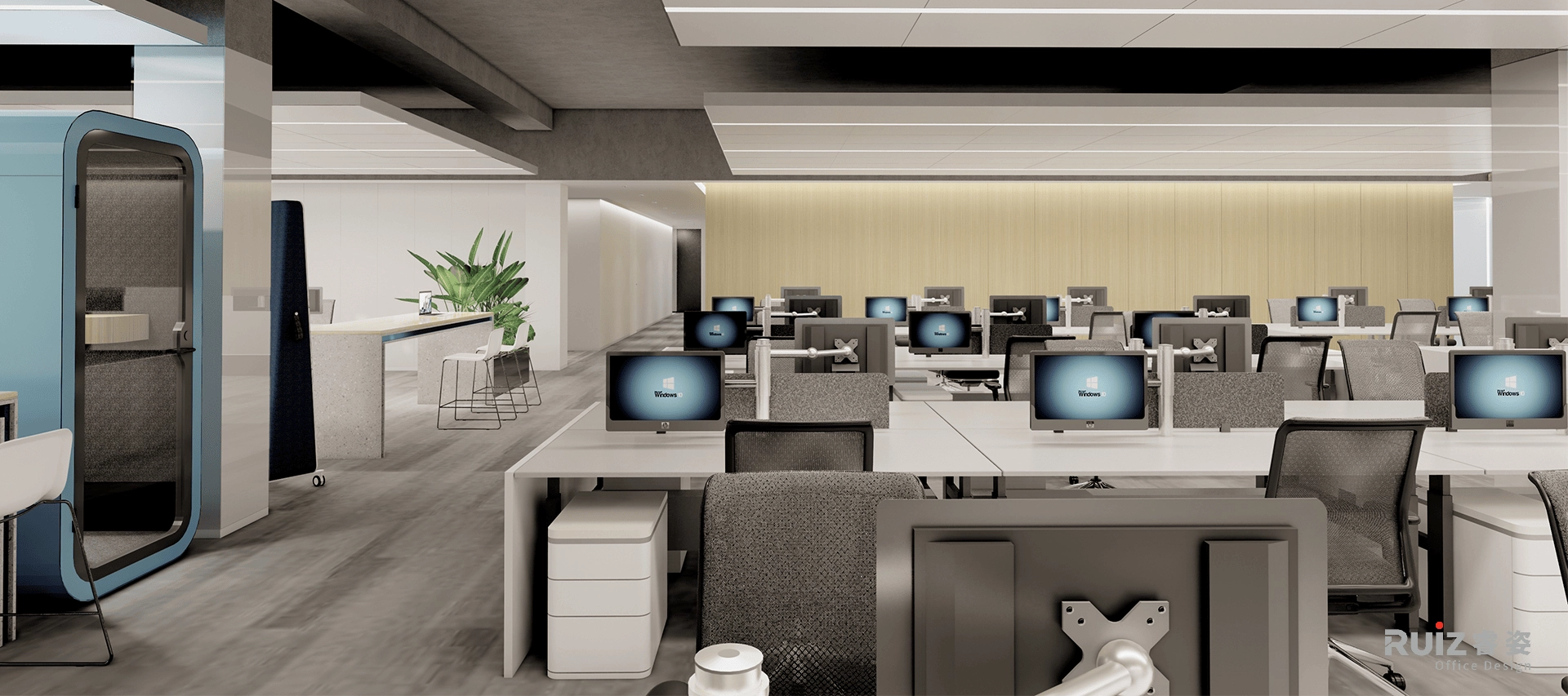 为及自然光照变化自动调节,打造高效节能的智慧办公体验。开放办公区与讨论区以共享与灵活为设计重点,鼓励团队协作与自由交流,员工休闲区与冥想空间提供可“放空”与