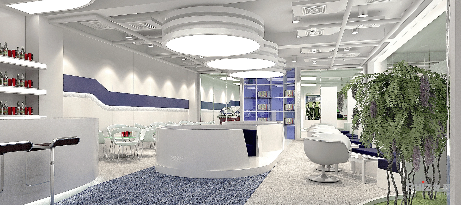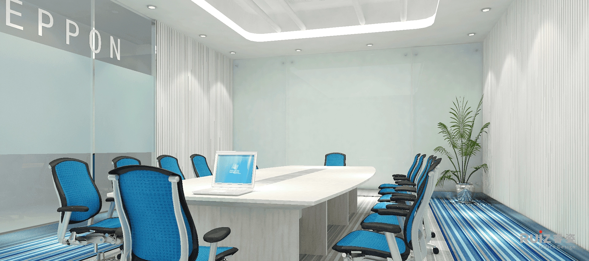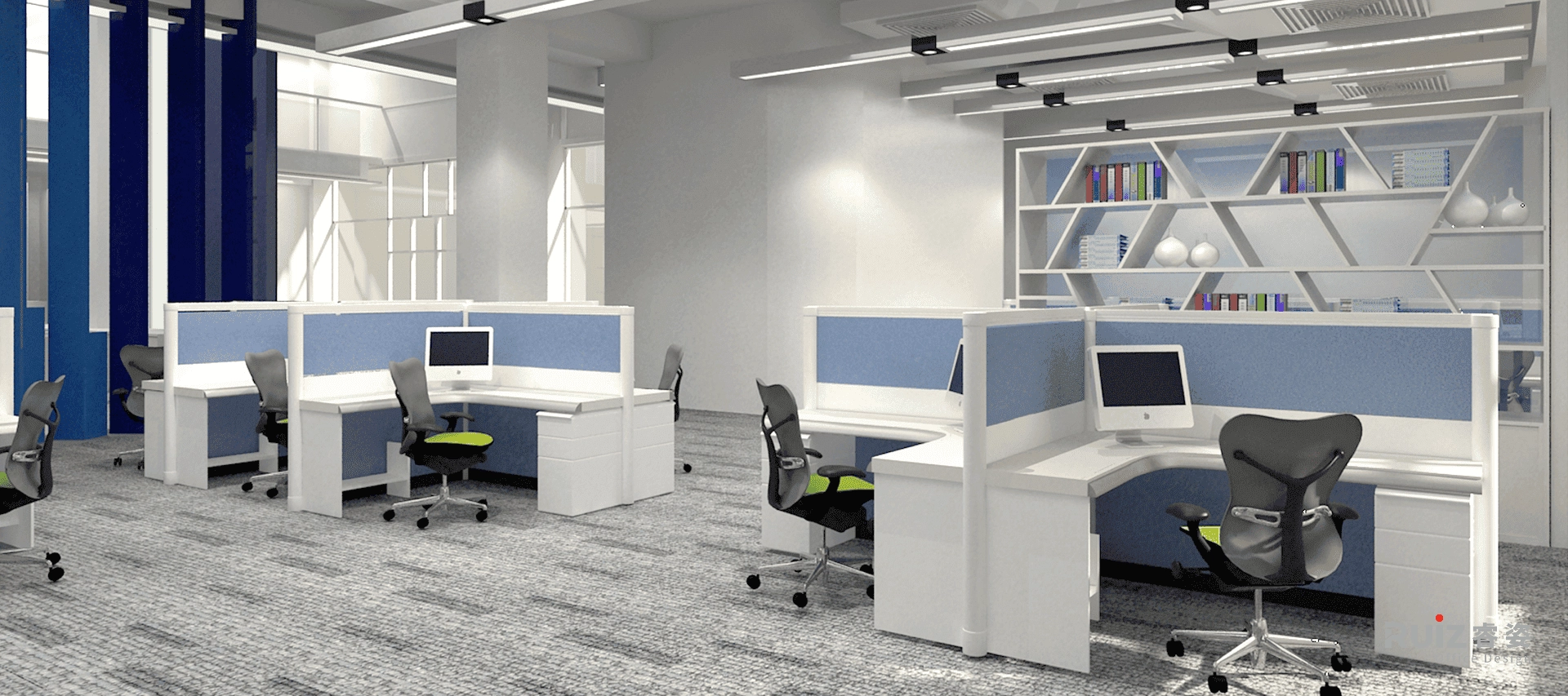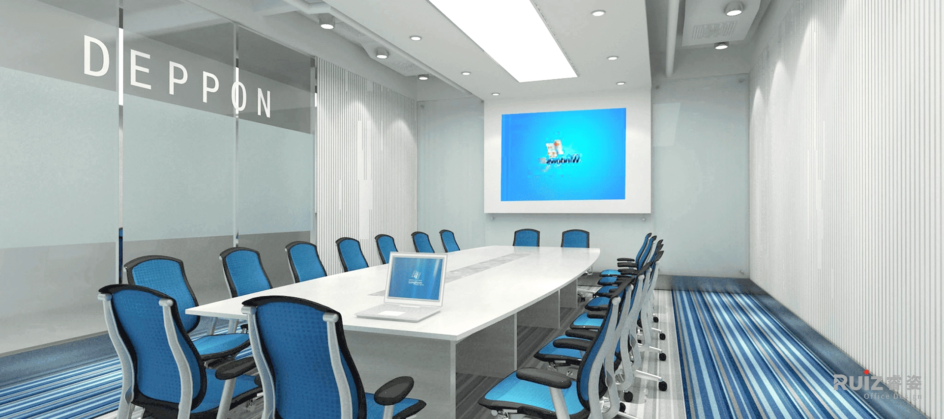 该空间是德邦物流的办公场所设计,因此在整体设计立意上以奔驰的货车为主题,例如,在地面、天花板的造型上,以高速公路上快慢车道的时速标志做装饰等手法。色彩上,室内空间中大面积以白色、灰色为背景色,局部点缀了企业形象色:蓝色——高速、冷静;橙色——活力、向上。