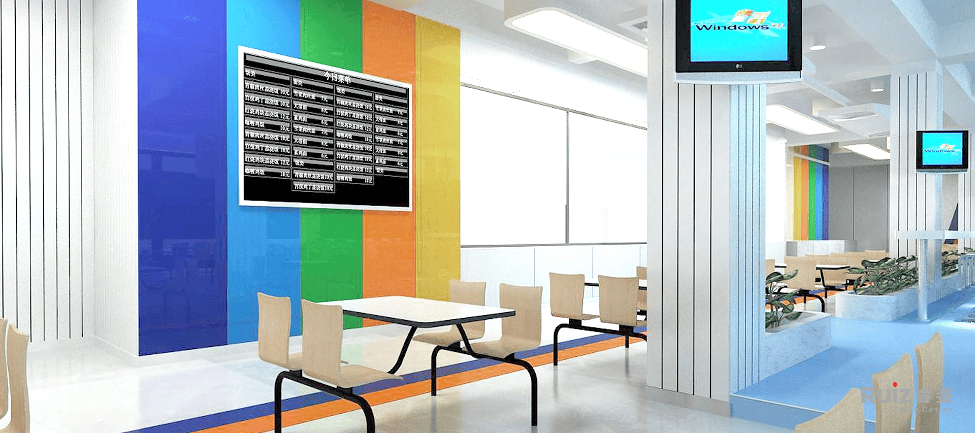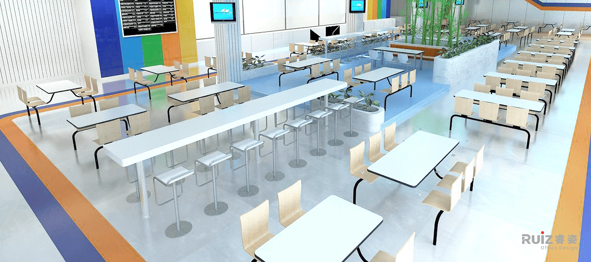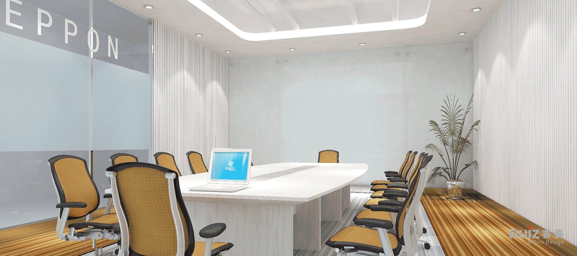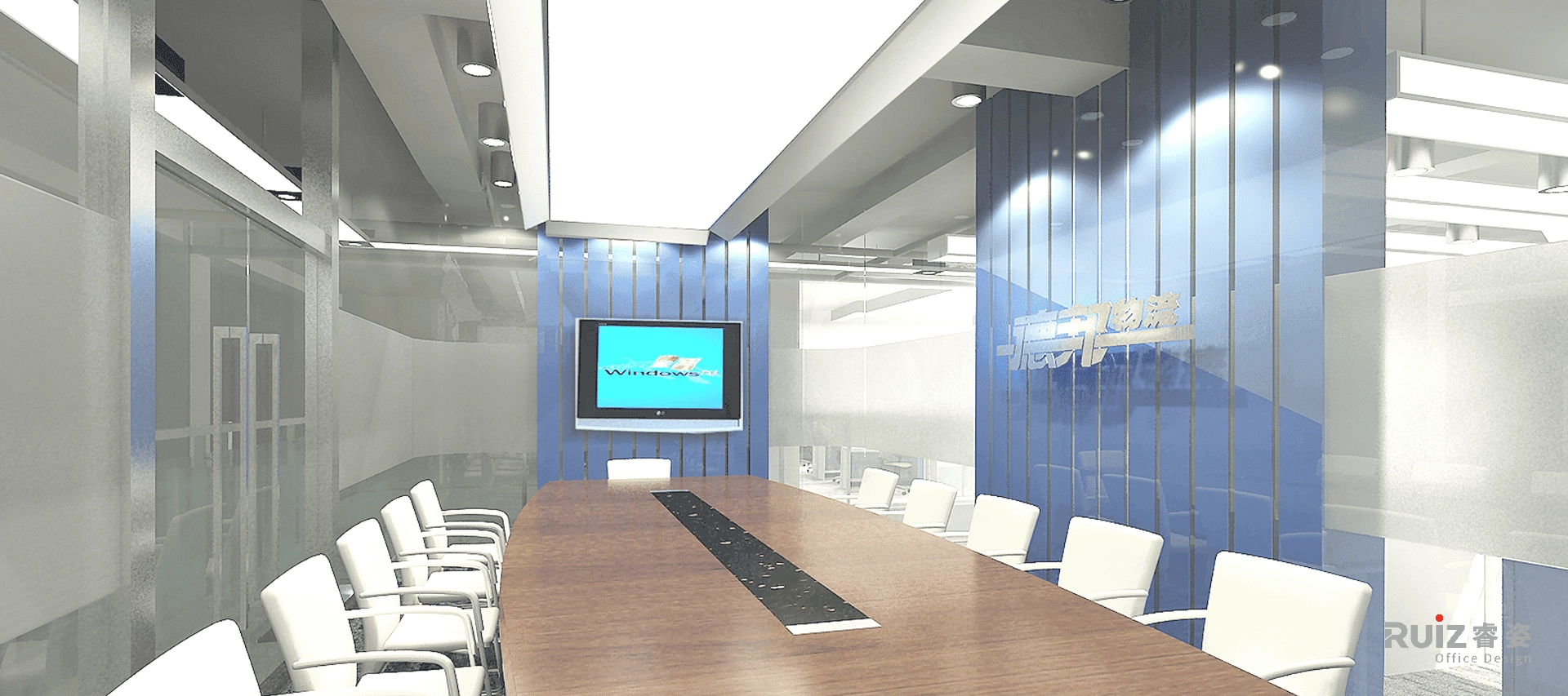 该空间是德邦物流的办公场所设计,因此在整体设计立意上以奔驰的货车为主题,例如,在地面、天花板的造型上,以高速公路上快慢车道的时速标志做装饰等手法。色彩上,室内空间中大面积以白色、灰色为背景色,局部点缀了企业形象色:蓝色——高速、冷静;橙色——活力、向上。