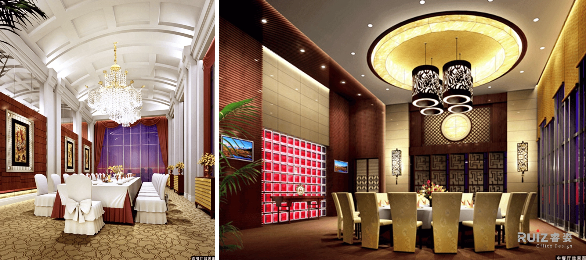 中西双餐厅设计融合欧式奢华与中式雅韵:西餐厅以古典欧式美学为核心,高层高搭配长形宴会桌、多层水晶吊灯及全景落地窗,象牙白、香槟金与棕色调交织,辅以艺术油画,营造宫廷式浪漫;中餐厅则立足新中式深色基调,红木圆桌、石膏板吊顶与垂坠宫灯诠释“天圆地方”,深胡桃木、玄黑与朱砂红碰撞,融入屏风等传统元素,传递东方禅意。两者均巧妙利用高层高纵向延伸视觉,借落地窗引景入室,并植入智能窗帘、光影系统实现实用与美学的平衡,通过东西方文化符号与材质对撞,打造多元场景体验,彰显品牌文化包容性与高端餐饮张力。