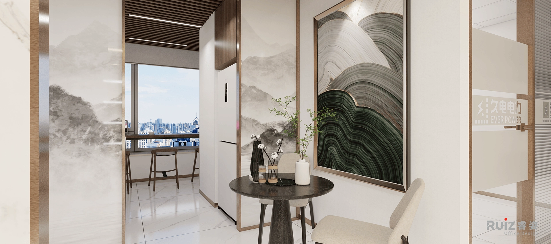 本项目系久电电力自购写字楼,坐落于蓝天大厦17层,整个项目按照客户要求为新中式风格设计,局部利用了原有装修翻新再生,既达到了效果有有效的控制了成本。