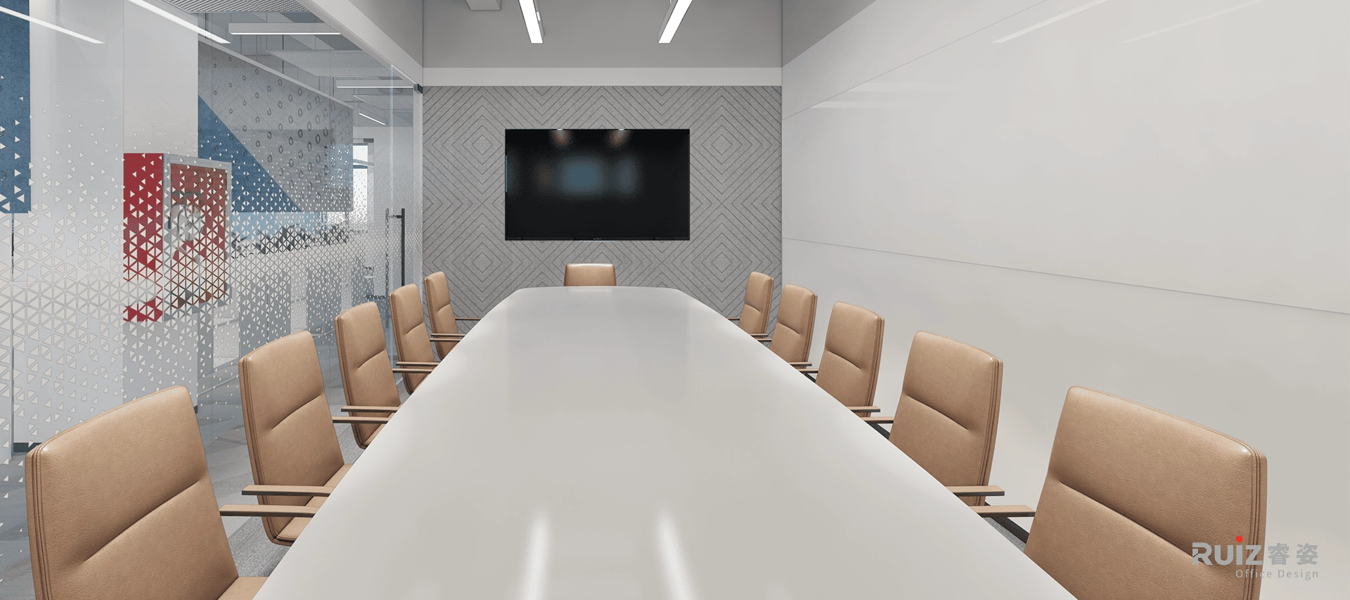 会议室延续裸顶工业基调,灰色管线保留粗犷质感,中央悬挂两条极简长条LED吊灯,聚焦照明并拉伸空间纵深感。核心配置白色哑光会议桌,搭配橙色皮质会议椅,以色彩碰撞激活讨论氛围;背景墙融合吸音板与嵌入式电视屏,侧边配备超白烤漆玻璃涂写板,实现书写、投屏与降噪多功能一体。整体以橙白对比、刚柔材质(金属与玻璃)及模块化科技设备,打造高效专注且充满张力的协作场景,呼应品牌活力基因。