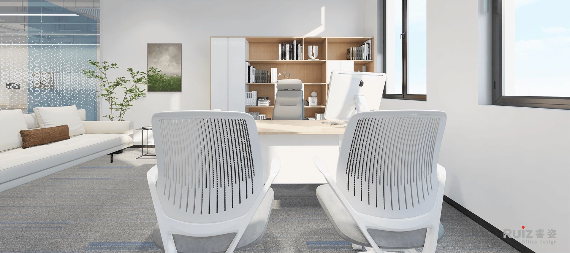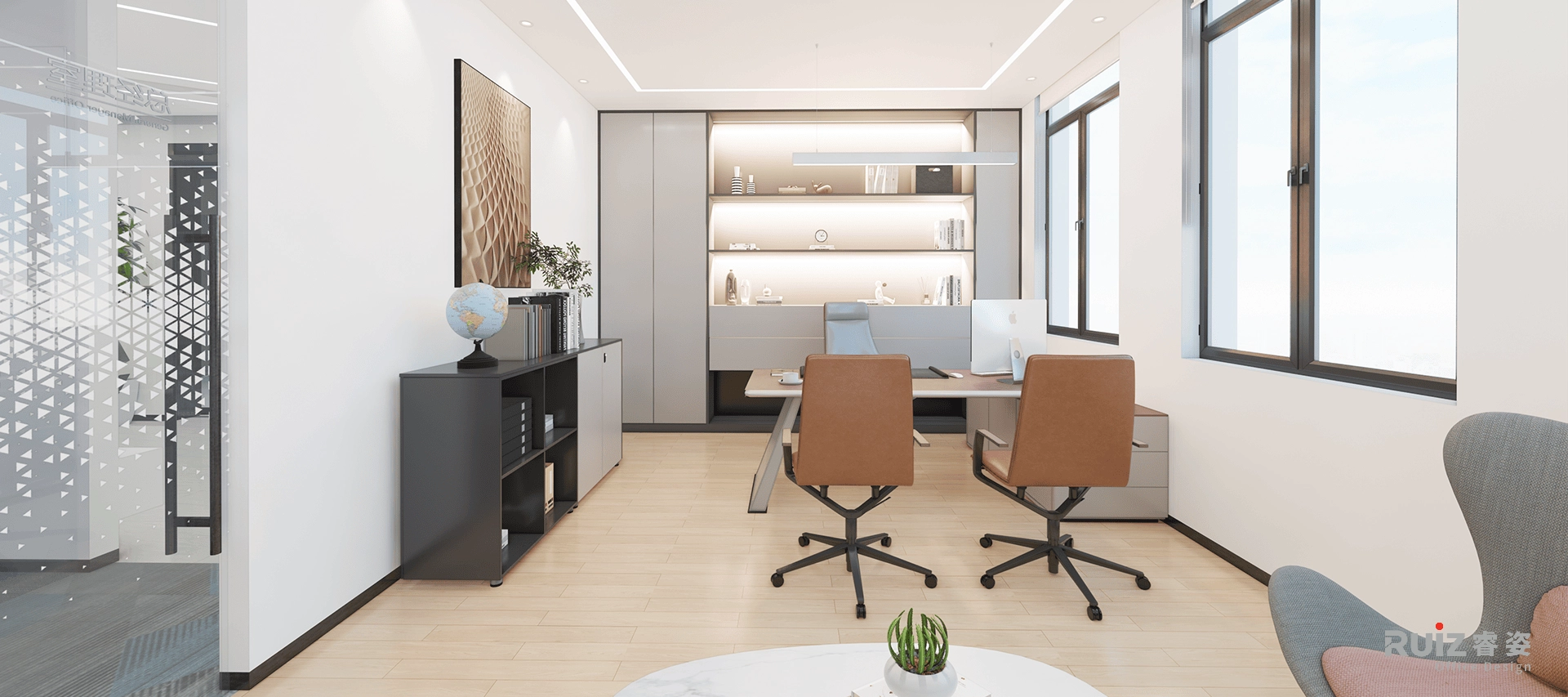 经理室采用极简白墙与浅灰背柜,搭配科技木地板,岩板桌、皮椅、悬浮书架及布艺沙发构成现代办公场景,线性灯与筒灯营造简洁光影,金属细节与绿植点缀平衡理性与温度。