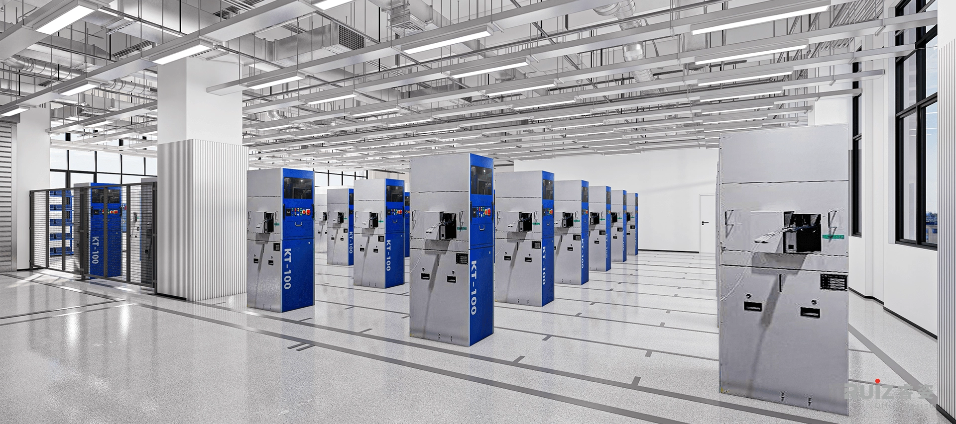 办公区以L形模块化白色桌组为单元,搭配科技木桌面(哑光饰面防眩光),形成简洁高效的工位矩阵;天花保留裸顶工业风,深灰色喷涂管线与条形灯结合,地面通铺蓝灰渐变地毯,通过色彩流动弱化方正布局,同时强化吸音降噪功能。茶水区切换为原木纹SPC地板,营造自然松弛的休憩氛围。整体空间通过材质冷暖对比、色彩渐变过渡及模块化组合逻辑,在工业基调中注入温润活力,实现高效协作与人文关怀的有机融合。